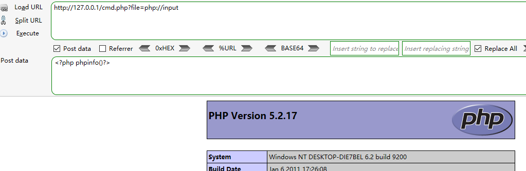 使用方法:php://input,然后post需要执行的数据 如http://127.0.0.1/cmd.php?file=php://input 然后在post中