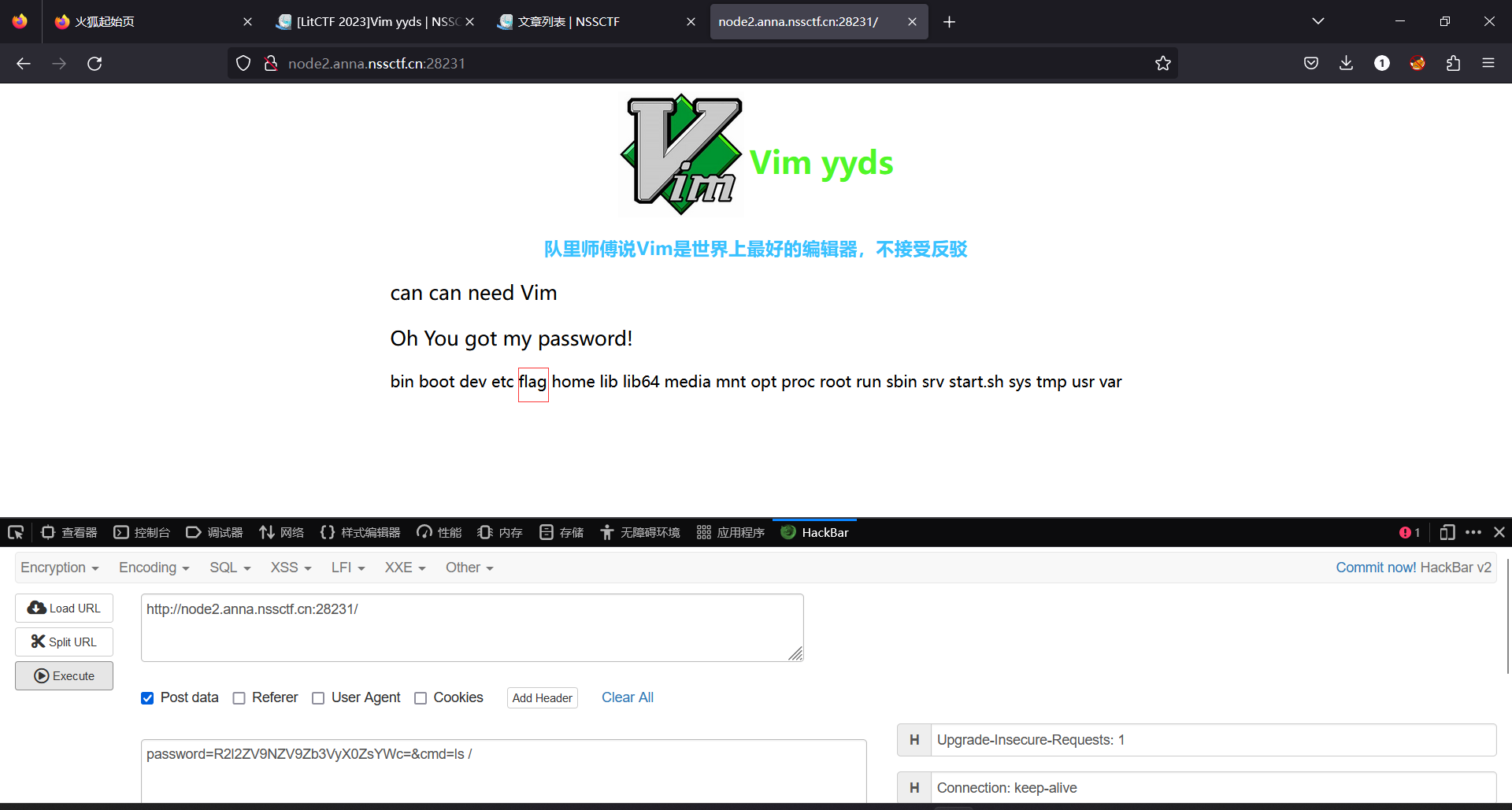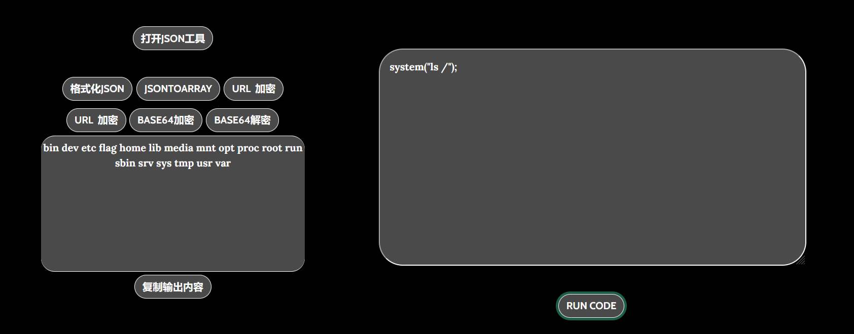 发现并没有flag,这时候想到了作者的提示,直接system(“ls /“)