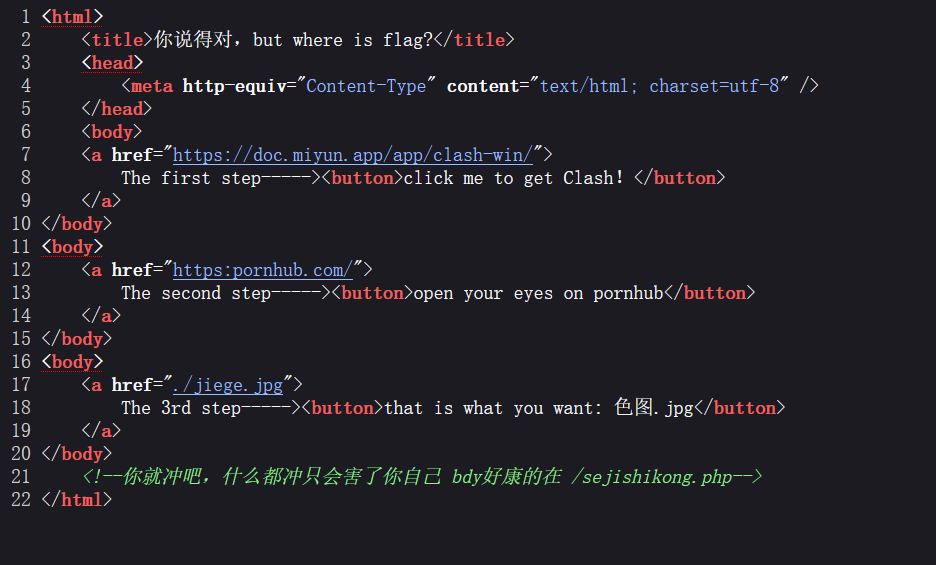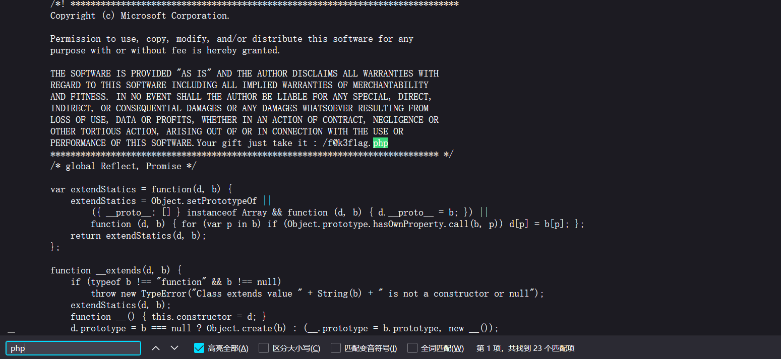 点进去,emmm。。。好多代码,不要慌!尝试从js或注释或php里入手,ctrl+f全局搜索一下,js没有有用的信息。搜索注释,太多了,最后实在没办法再考虑。搜索php,我们发现有一个被注释的php文件