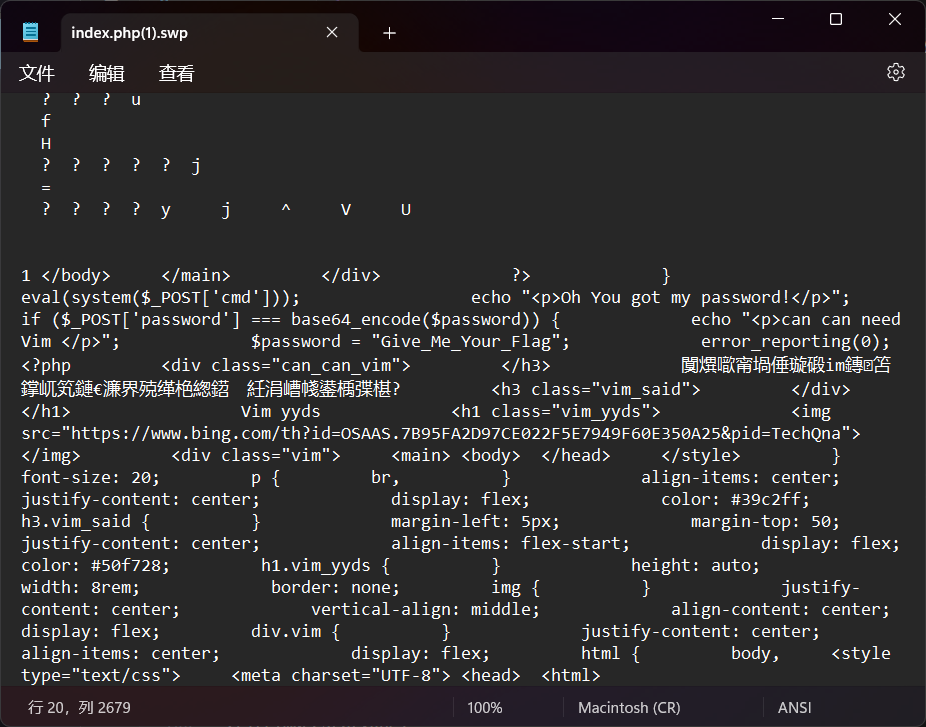 vim编辑的index.php文件,在编辑状态强制退出终端,会在同目录下产生一个.index.php.swp文件,所以我们可以访问.index.php.swp,下载下来