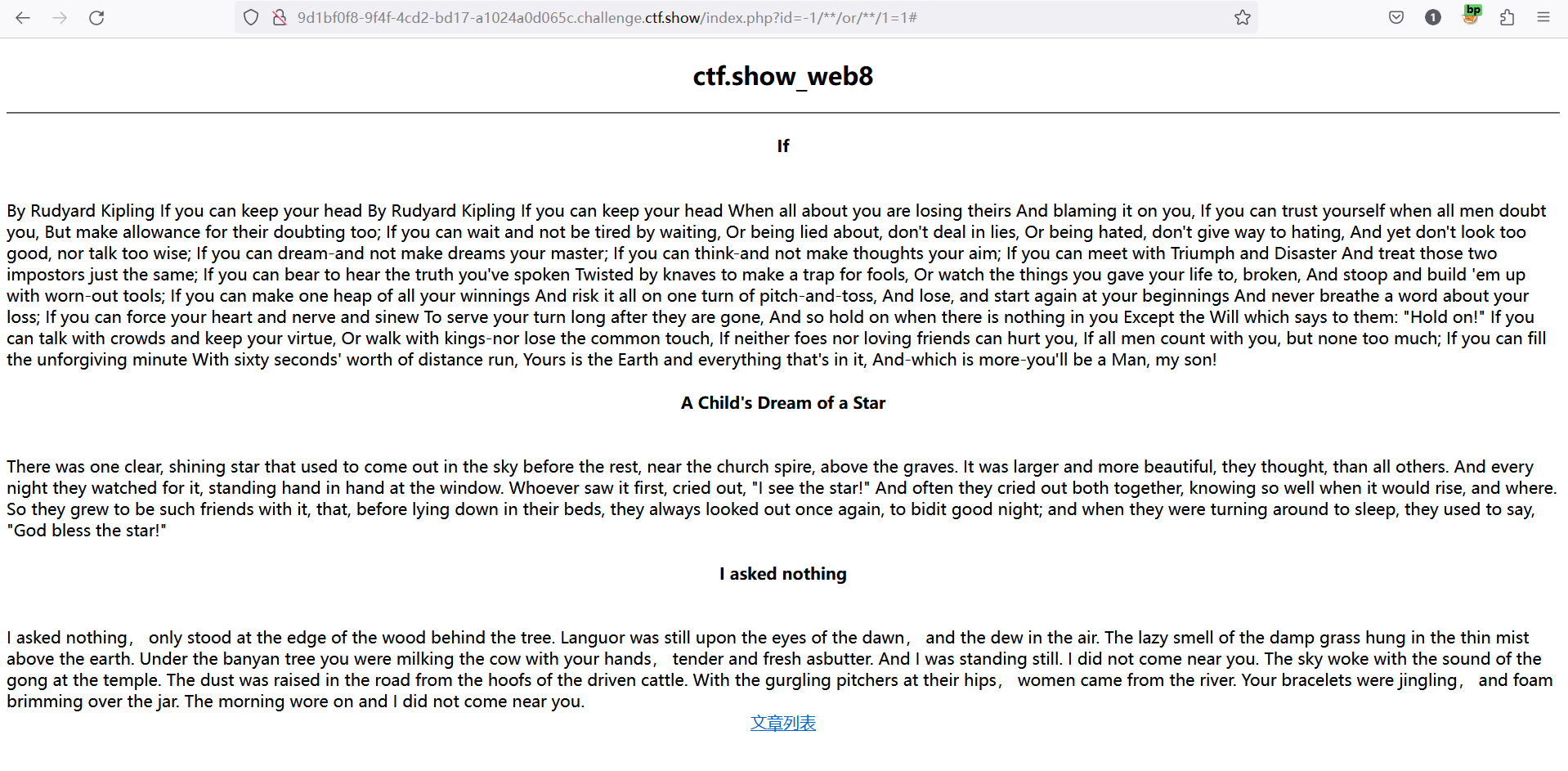 一共有三个文章,通过点击切换不同的文章可以看出url地址的差别,页面同过文章的id值来查询文章内容,我们可以考虑sql注入漏洞