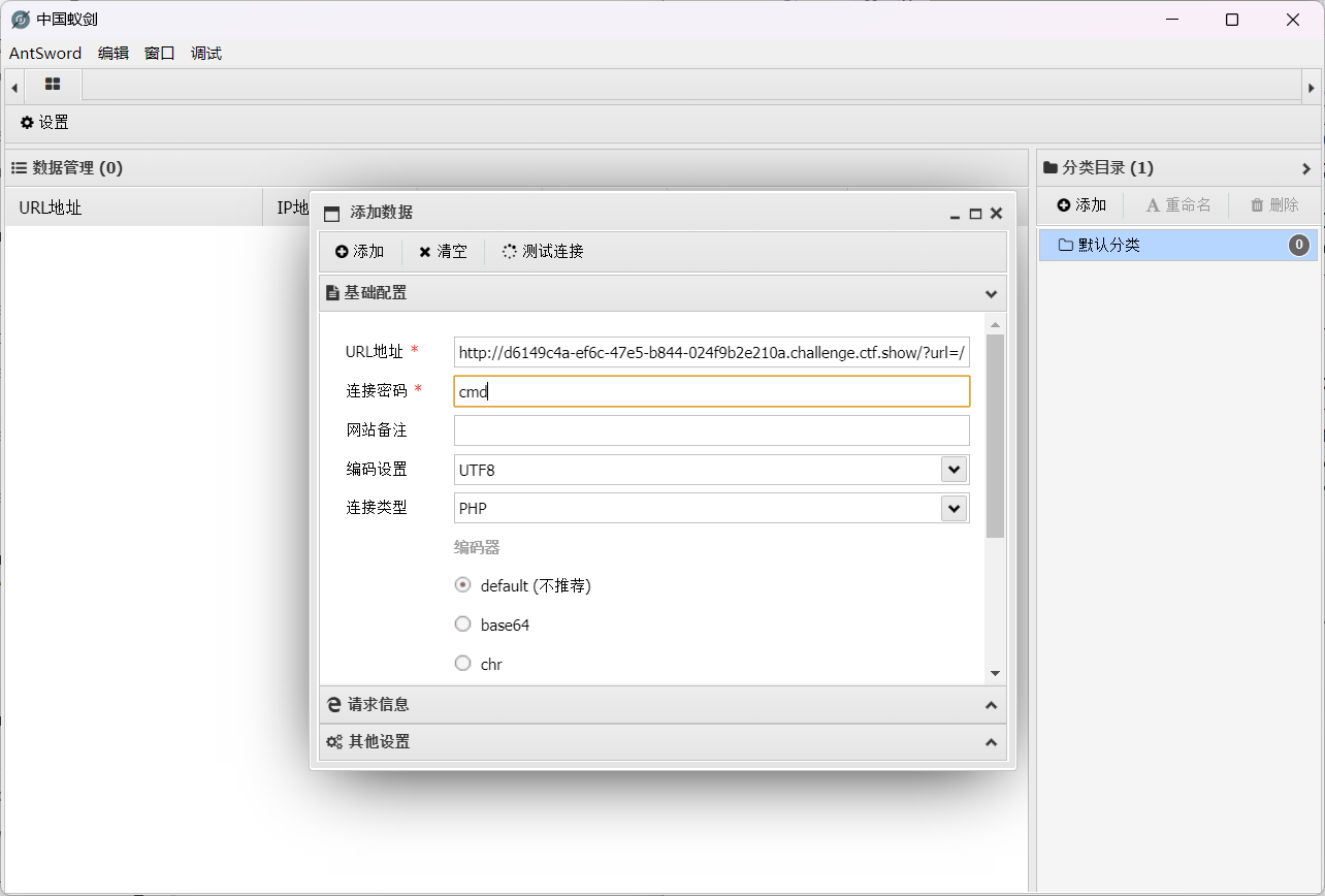 上传成功后,打开中国蚁剑,连接成功后发现没有权限操作,回到页面,POST提交a=print_r(glob("*"));