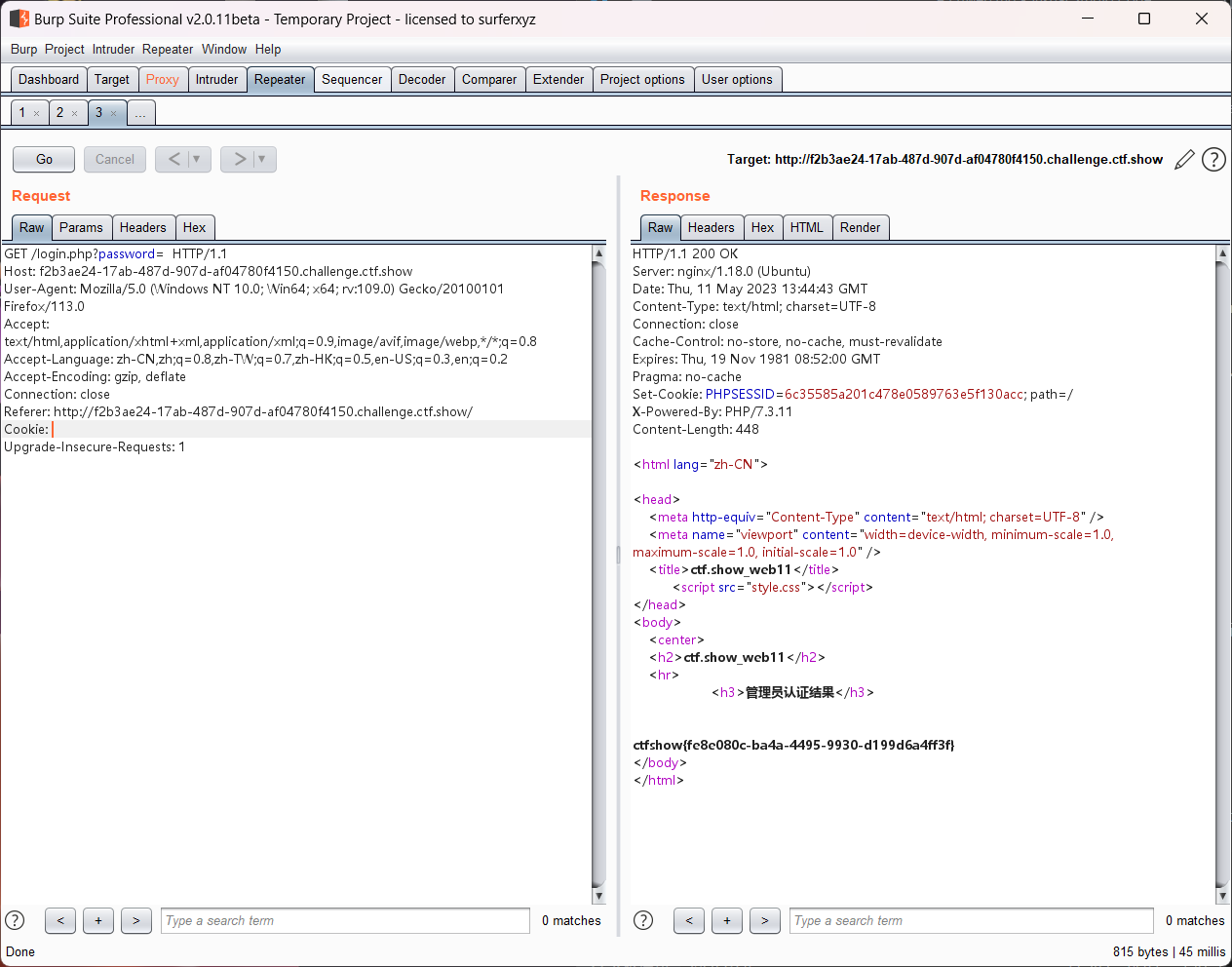 password是我们自己输入的,session中的password存储在本地,所以我们只要输入空密码,并且将本地的session删除即可成功绕过,获得flag