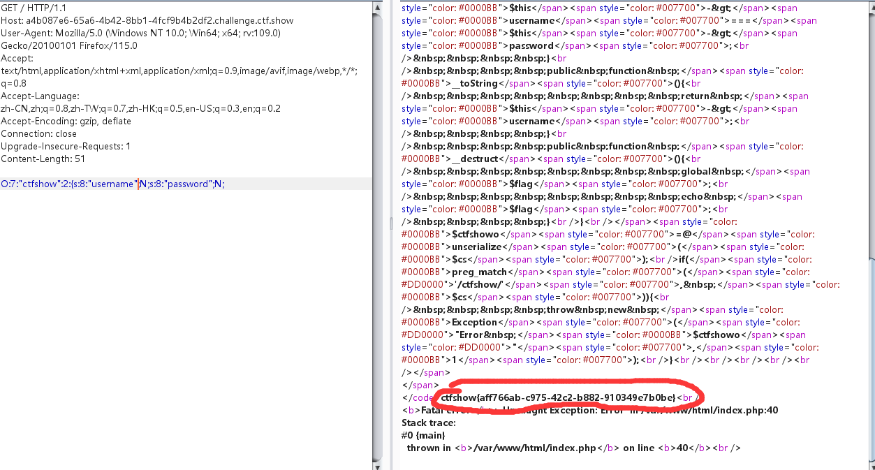 web266 1 2 3 4 5 6 7 8 9 10 11 12 13 14 15 16 17 18 19 20 21 22 23 24 25 26 27 28 29 30 31 32 <?php highlight_file (__FILE__ );include ('flag.php' );$cs = file_get_contents ('php://input' );class ctfshow { public $username ='xxxxxx' ; public $password ='xxxxxx' ; public function __construct ($u ,$p ) { $this ->username=$u ; $this ->password=$p ; } public function login ( ) { return $this ->username===$this ->password; } public function __toString ( ) { return $this ->username; } public function __destruct ( ) { global $flag ; echo $flag ; } }$ctfshowo =@unserialize ($cs );if (preg_match ('/ctfshow/' , $cs )){ throw new Exception ("Error $ctfshowo " ,1 ); }