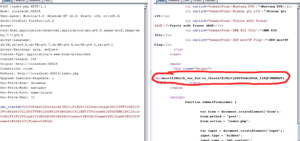 web–了解你的座驾 下翻到XDU moeCTF Flag 获得信息flag掉到根目录里 用burpsuite抓取到post,xml_content=<xml><name>XDU moeCTF Flag</name></xml>