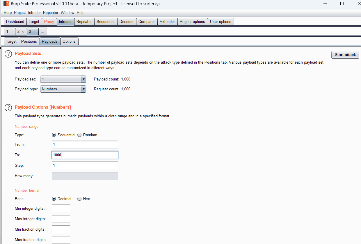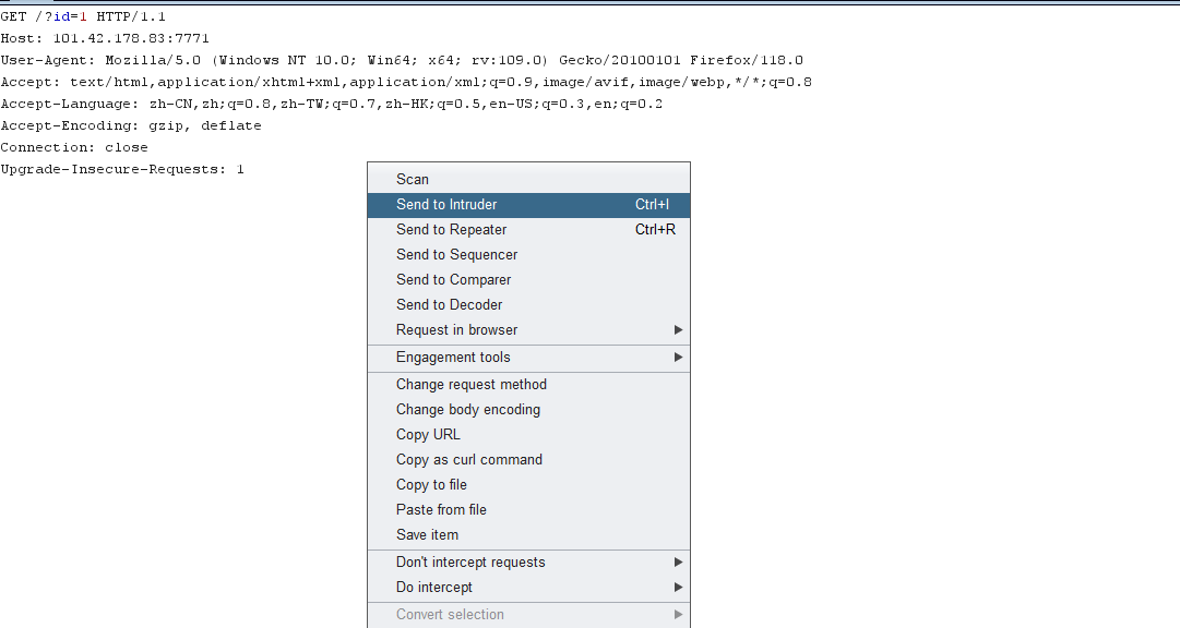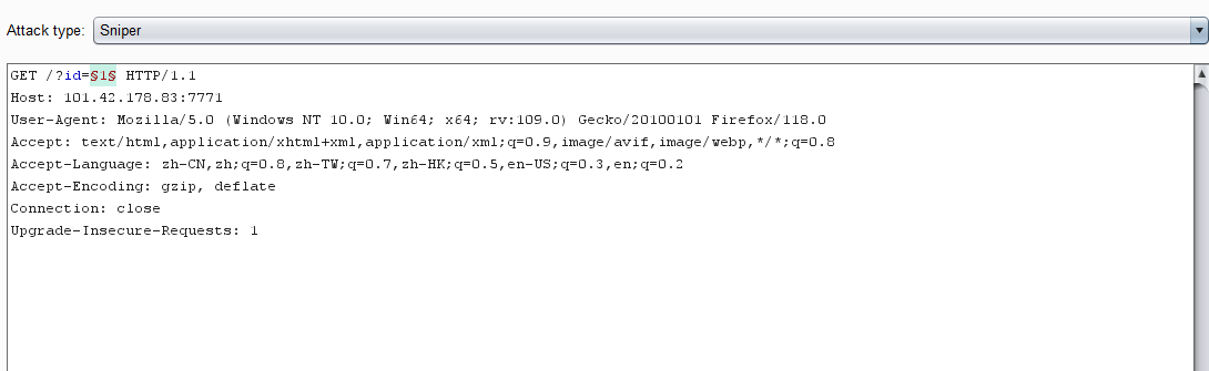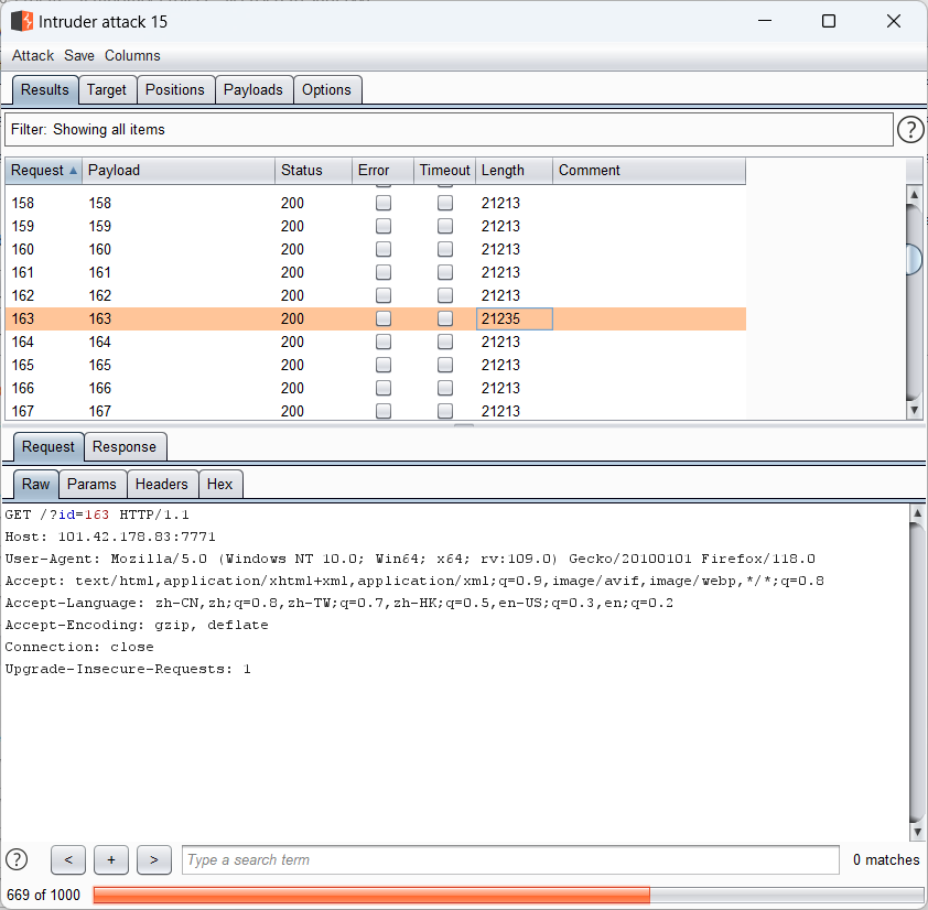 web–大海捞针 题目告诉了需要使用爆破 , use /?id=<1-1000> to connect to different parallel universes (it might seem wired that the index is between 1 and 1000…) 进入题目也说明了flag藏在这1000个页面中 随便输入一个?id=1抓包 send后进入intruder 使用sniper方法爆破id payloads配置如下: 即可开始爆破 发现id=163 len不同 response查看找出flag