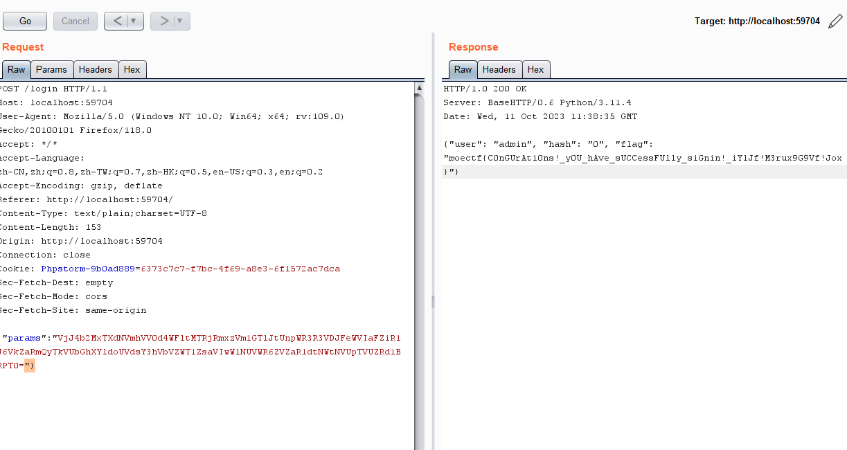1 2 3 4 5 6 7 8 9 10 11 12 13 hashed = gethash (params.get ("username" ),params.get ("password" )) for k,v in hashed_users.items (): if hashed == v: data = { "user" :k, "hash" :hashed, "flag" : FLAG if k == "admin" else "flag{YOU_HAVE_TO_LOGIN_IN_AS_ADMIN_TO_GET_THE_FLAG}" } self.send_response (200 ) self.end_headers () self.wfile .write (json.dumps (data).encode ()) print ("success" ) return