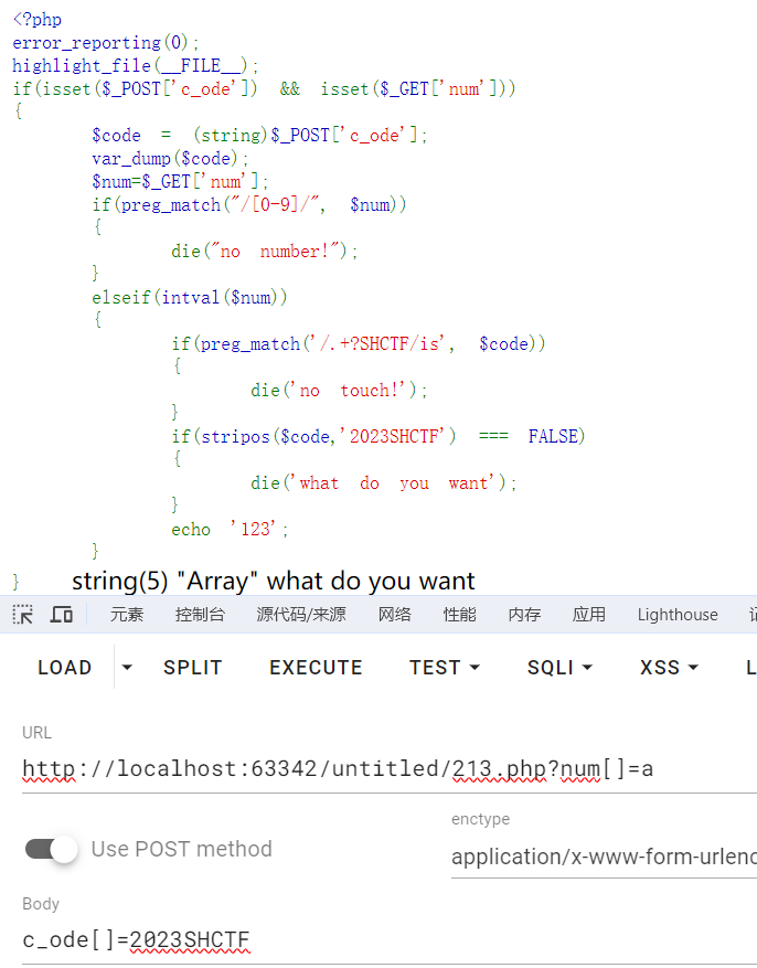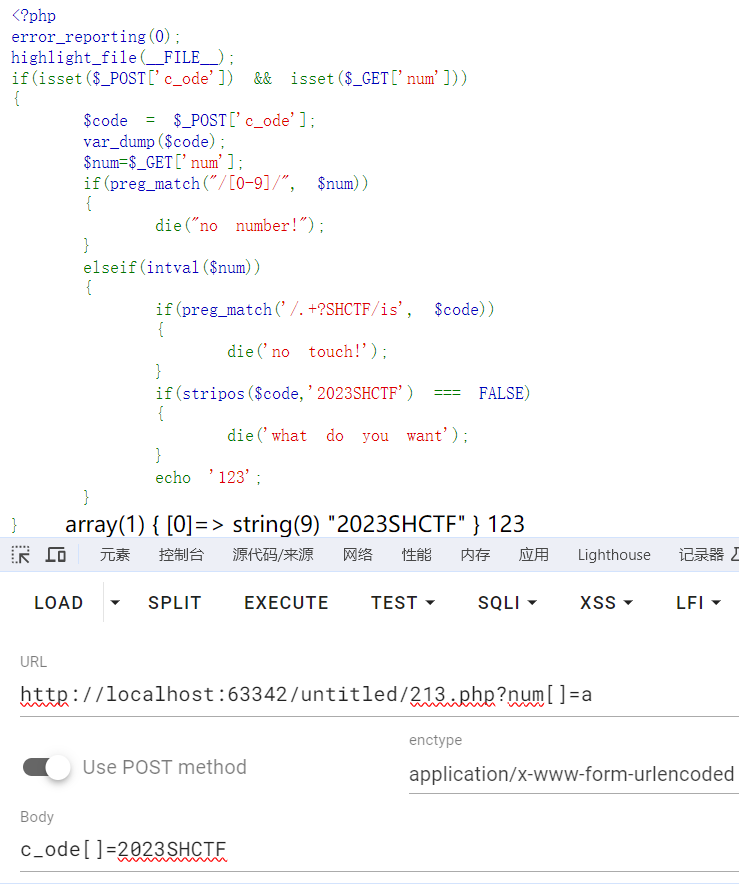 | <?php error_reporting(0); highlight_file('./index.txt'); if(isset($_POST['c_ode']) && isset($_GET['num'])) { $code = (String)$_POST['c_ode']; $num=$_GET['num']; if(preg_match("/[0-9]/", $num)) { die("no number!"); } elseif(intval($num)) { if(preg_match('/.+?SHCTF/is', $code)) { die('no touch!'); } if(stripos($code,'2023SHCTF') === FALSE) { die('what do you want'); } echo $flag; } }