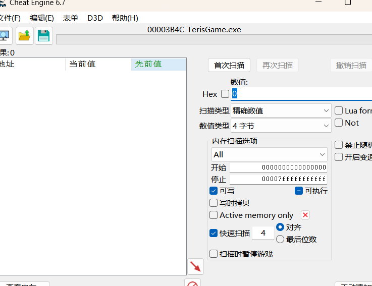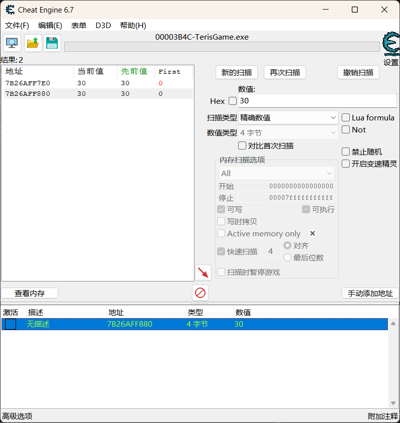 当前的分数为0 在CE上抓取这个进程 数值改为0,点击首次扫描 出现了很多地址,先不管 先玩游戏 现在我们得了20分,更新一下CE的数值,并再次扫描 这次缩小为4个地址,看来我们要再来一次 现在是30,重复上述操作 现在缩小为两个 选其中一个双击添加到地址栏 再次双击改变其值 可以看到成功改变 结束游戏后就可获得flag
