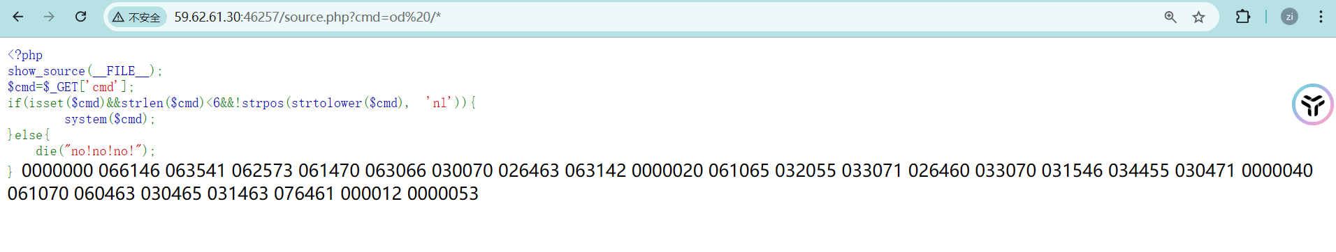 1 2 3 4 5 6 7 8 <?php show_source (__FILE__ );$cmd =$_GET ['cmd' ];if (isset ($cmd )&&strlen ($cmd )<6 &&!strpos (strtolower ($cmd ), 'nl' )){ system ($cmd ); }else { die ("no!no!no!" ); }