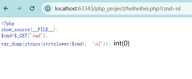 当时做题的时候确实给我晃到了,以为是把nl过滤了 其实不是,它返回的是匹配的位置 strpost() 所以 所以!strpos(strtolower($cmd), ‘nl’)就是true了,在输入其它字符时也不影响,没有匹配到返回的是false,前面加个!就是true了,很巧妙 所以payload