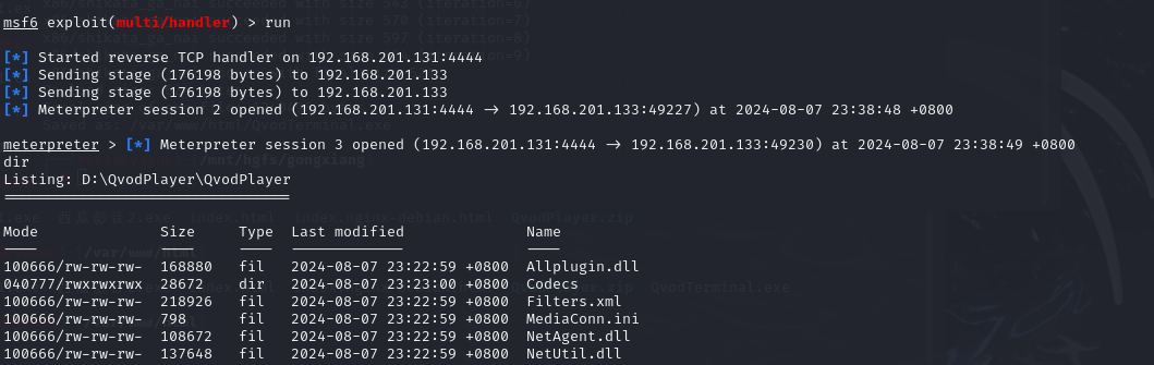 将下载的 QvodTerminal.exe 替换原文件中的 QvodTerminal.exe在kali上开始监听后门