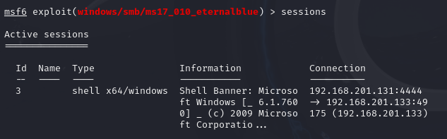 - 在kali上查看会话已经建立了,说明后门运行成功了