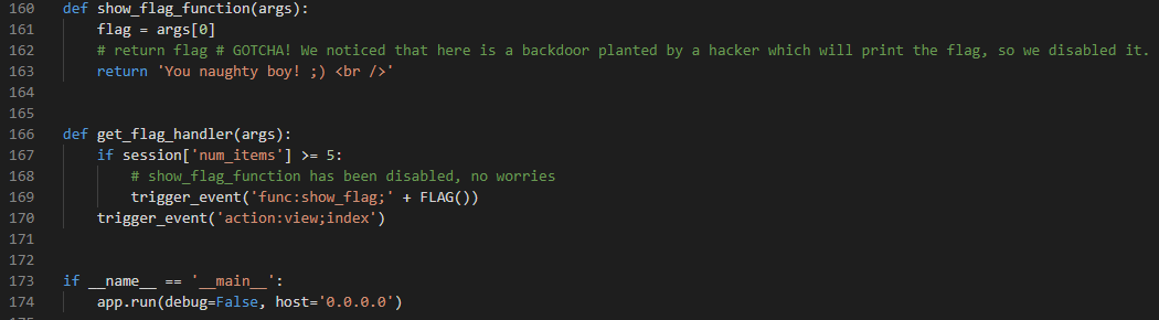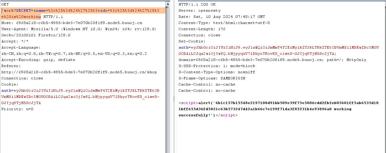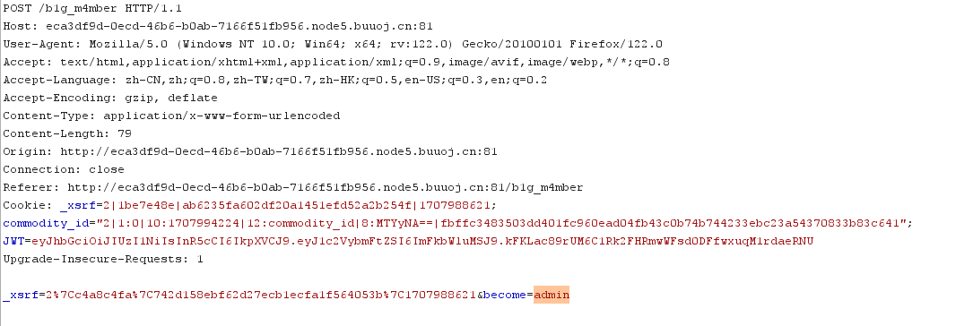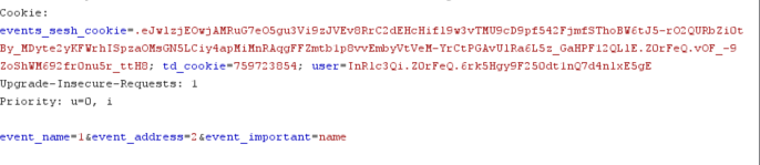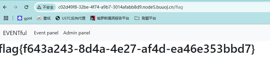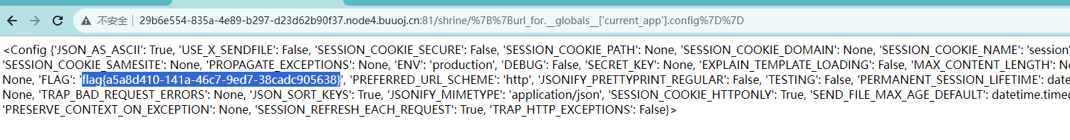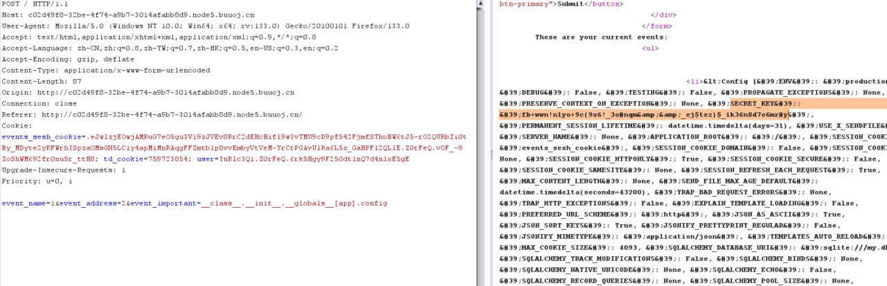 [FBCTF2019]Event 打开题目,只有一个登录注册狂,无法使用admin登录注册 在/flag页面中提示我们并不是管理员,猜测要得到管理员权限才可以Get Flag 在主页看到表单,随意输入一些值进去,页面回显了输入的值 这里可能存在xss或者ssti,尝试后,无xss,应该存在ssti 抓包发现cookie,event_sesh_cookie应该是jwt加密过 大致猜测出本题应该是可以通过SSTI得到密钥伪造cookie,越权登录admin的账户 在提交数据时,有三个可控参数,经测试在event_important参数存在模板注入,输入__dict__,发现成功回显 接着查找配置文件