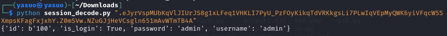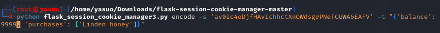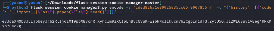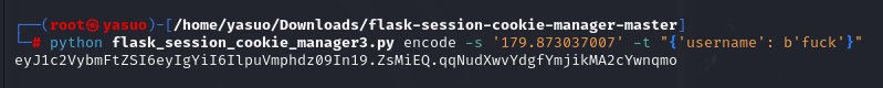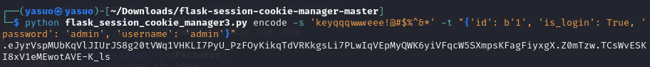 1 python flask_session_cookie_manager3.py encode -s 'keyqqqwwweee!@#$%^&*' -t "{'id' : b'1' , 'is_login' : True, 'password' : 'admin' , 'username' : 'admin' }"