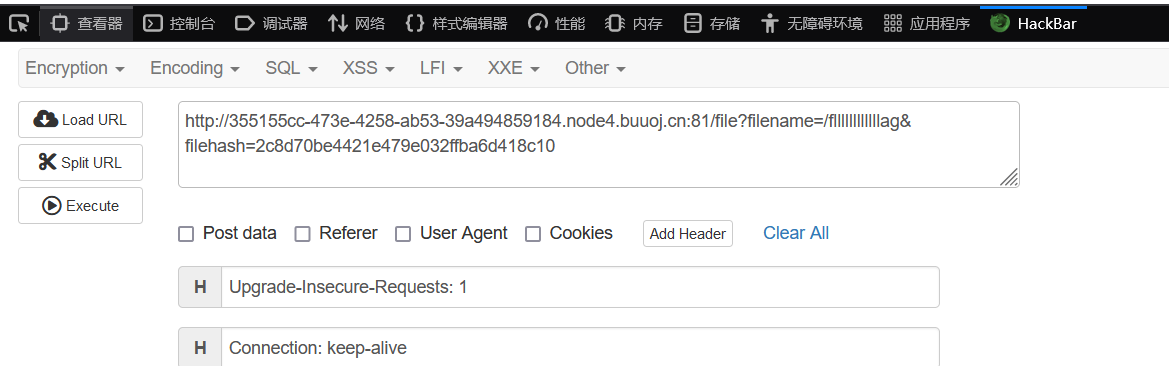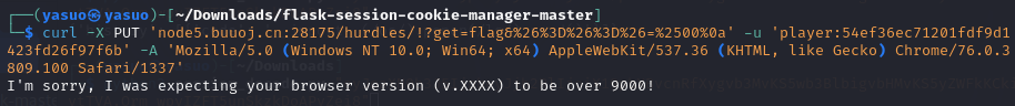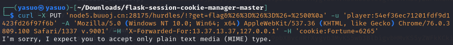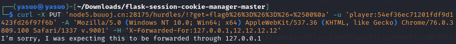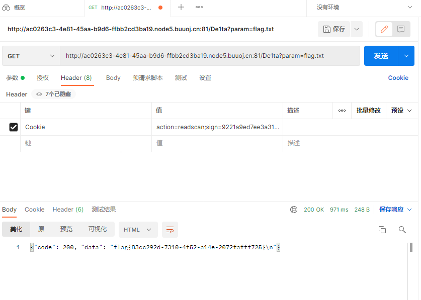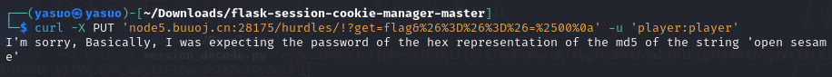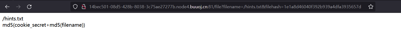 回到hints.txt 现在已经知道了cookie_secret的值,MD5(filename)就是/fllllllllllllag的MD5的值 =3bf9f6cf685a6dd8defadabfb41a03a1 把cookie_secret和MD5(filename)加起来再进行MD5加密即可得出flag
