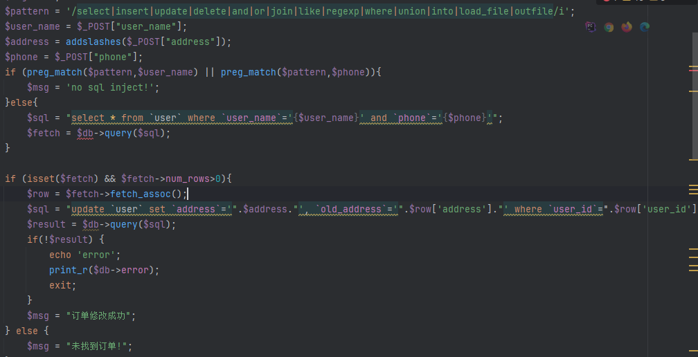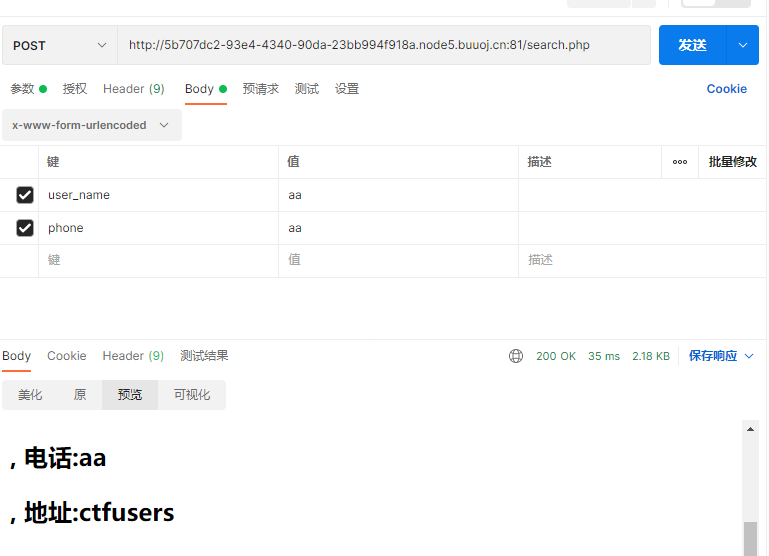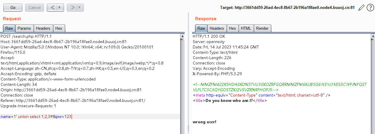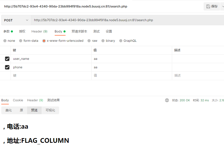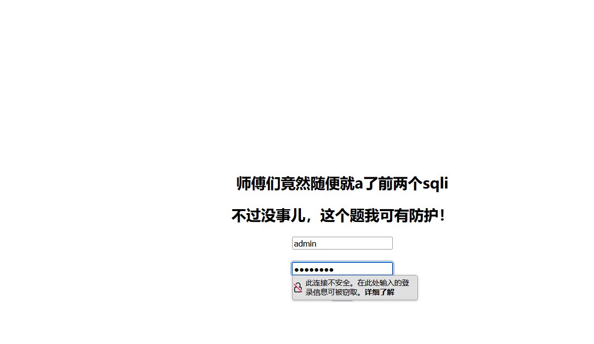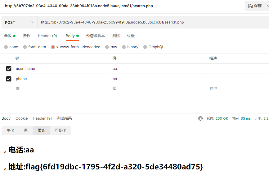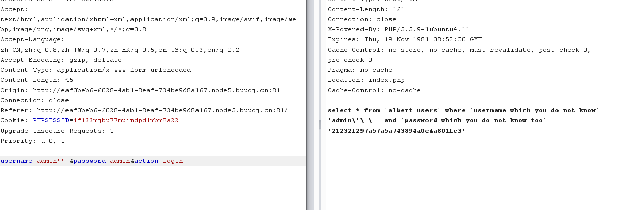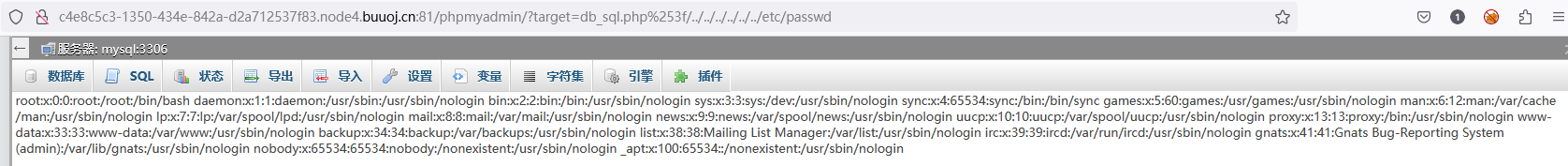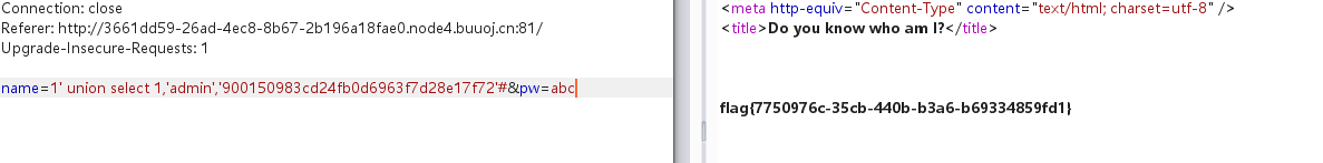 1 2 3 4 5 6 7 8 9 10 11 12 13 14 15 16 17 18 19 20 21 22 23 24 25 26 27 28 29 30 31 32 33 34 35 mysqli_query($con ,'SET NAMES UTF8' );$name = $_POST ['name' ];$password = $_POST ['pw' ];$t_pw = md5($password );$sql = "select * from user where username = '" .$name ."'" ;// echo $sql ;$result = mysqli_query($con , $sql );if (preg_match("/\(|\)|\=|or/" , $name )){ die("do not hack me!" ); }else { if (!$result ) { printf("Error: %s\n" , mysqli_error($con )); exit (); } else { // echo '<pre>' ; $arr = mysqli_fetch_row($result ); // print_r($arr ); if ($arr [1 ] == "admin" ){ if (md5($password ) == $arr [2 ]){ echo $flag ; } else { die("wrong pass!" ); } } else { die("wrong user!" ); } } }