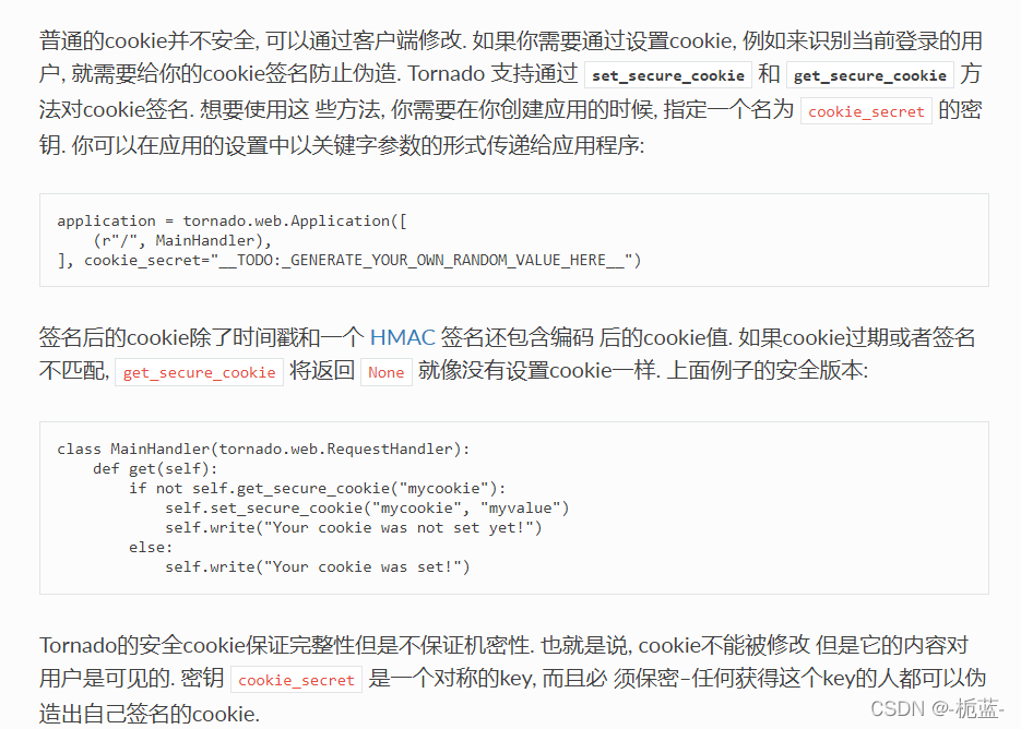 [护网杯 2018]easy_tornado 1 进入答题页面,发现三个超链接 分别点击进去 再点击进去后url中传输了两个参数,一个是filename,另一个是filehash,在第一个flag.txt中把filename改为提示的/fllllllllllllag试试 提交后页面显示error 看来拿到flag的关键就在于解出filehash是什么,根据第三个超链接的提示,应该是filehash=md5(cookie_secret+md5(filename)),filename现已知,但cookie_secret是什么呢,而且第二个rander也没有用到,也并不清楚有什么用,只能去查一下tornado框架有什么特点了tornado框架的介绍