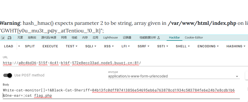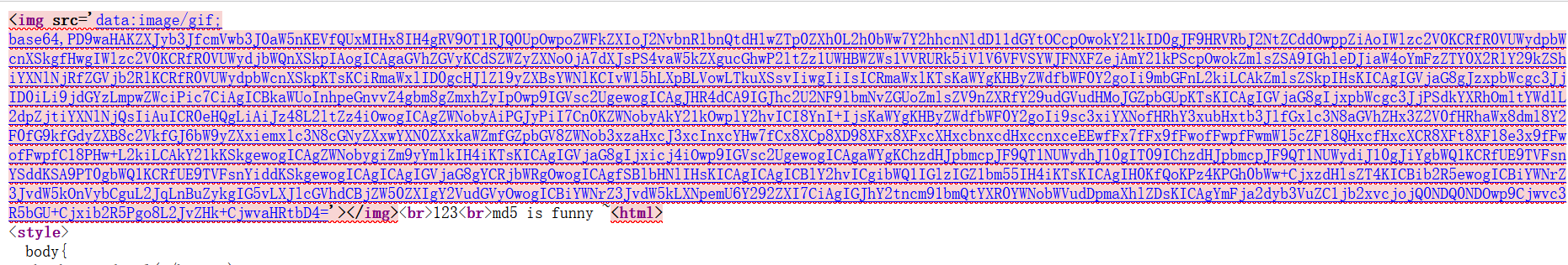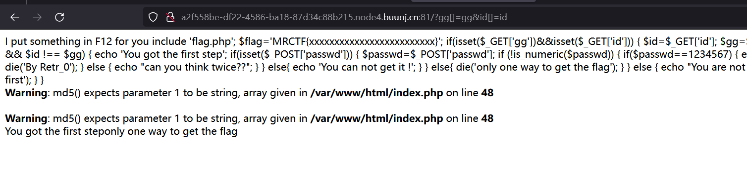 绕过这个if要先想到MD5漏洞,我先想到的是0e开头的漏洞 ps:md5 值是 0e 开头,在 php 弱类型比较中判断为相等 再看回来,弱比较是==,而本题中是===强比较,所以不能用这个绕过 在查阅后发现还有一种方法——数组绕过a[]=a&b[]=b