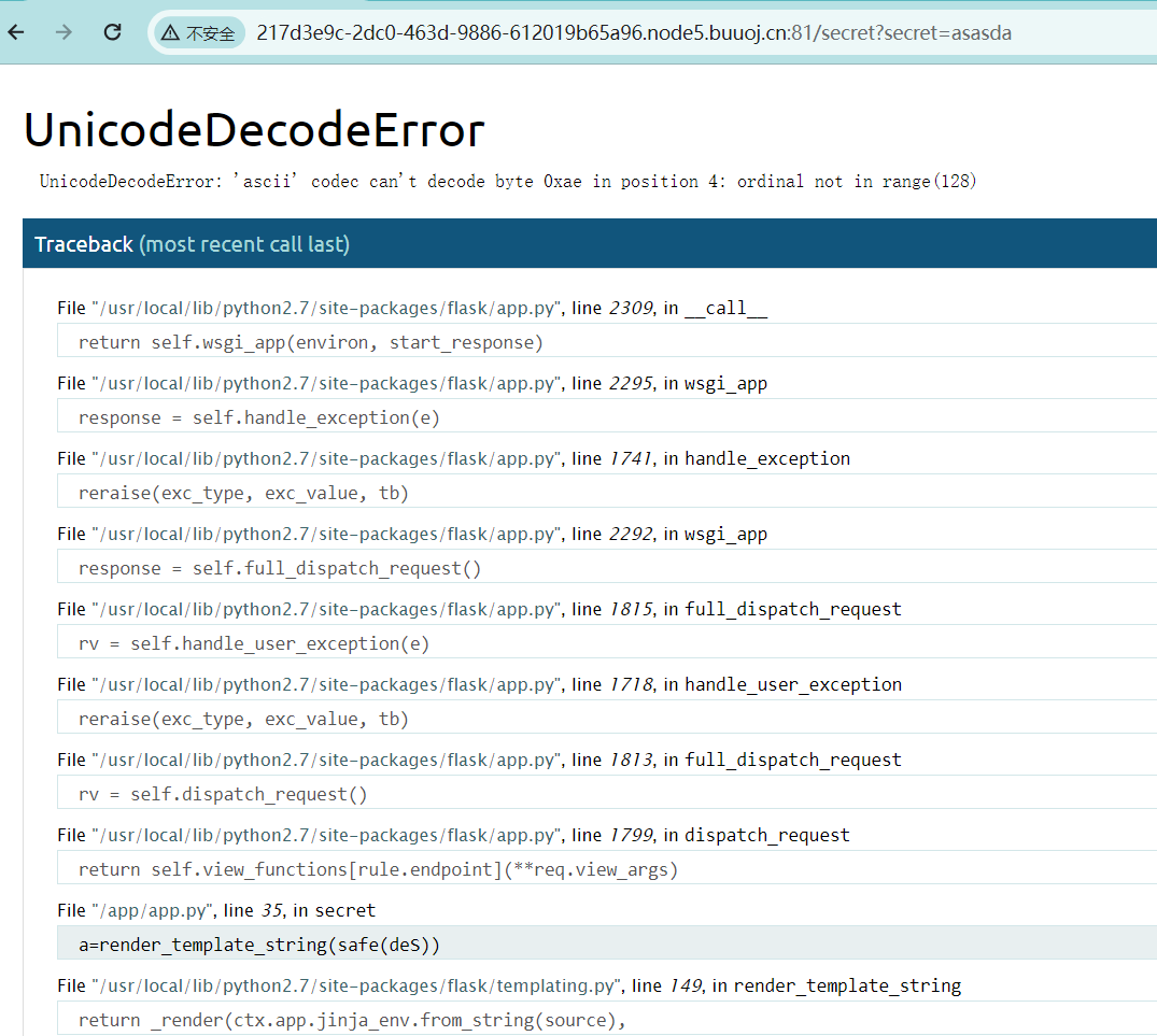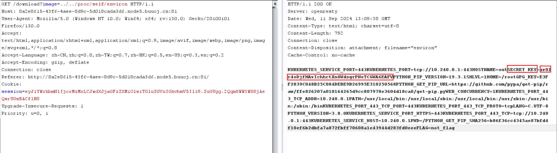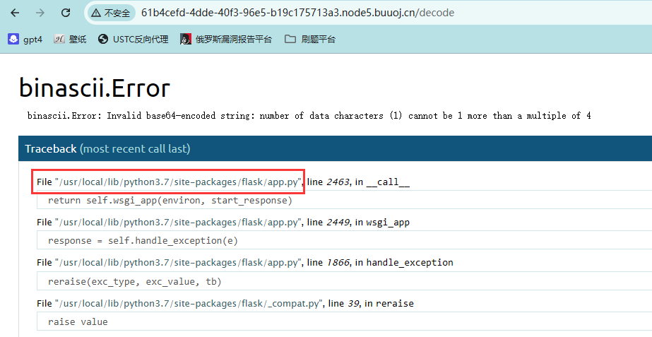 其中username属性和password属性均为admin,可能后端是验证id属性的值,尝试伪造session,但需要SECRET_KEY的值,SECRET_KEY是Flask中的通用密钥,主要在加密算法中作为一个参数,这个值的复杂度影响到数据传输和存储时的复杂度,密钥最好存储在系统变量中。 访问一个不存在的目录,查看请求头 base64解码 得到