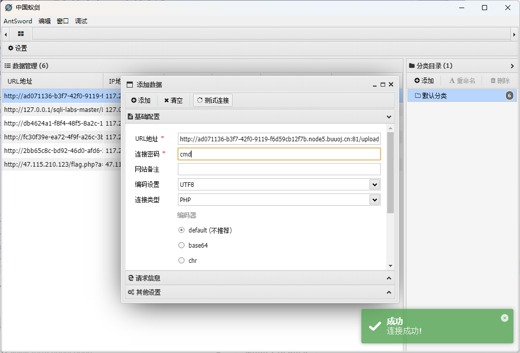 上传之后他会给一个连接,进入/upload之后的连接,用蚁剑连接也不能成功连接,也写不了命令,那么我们只有换一种方法了。