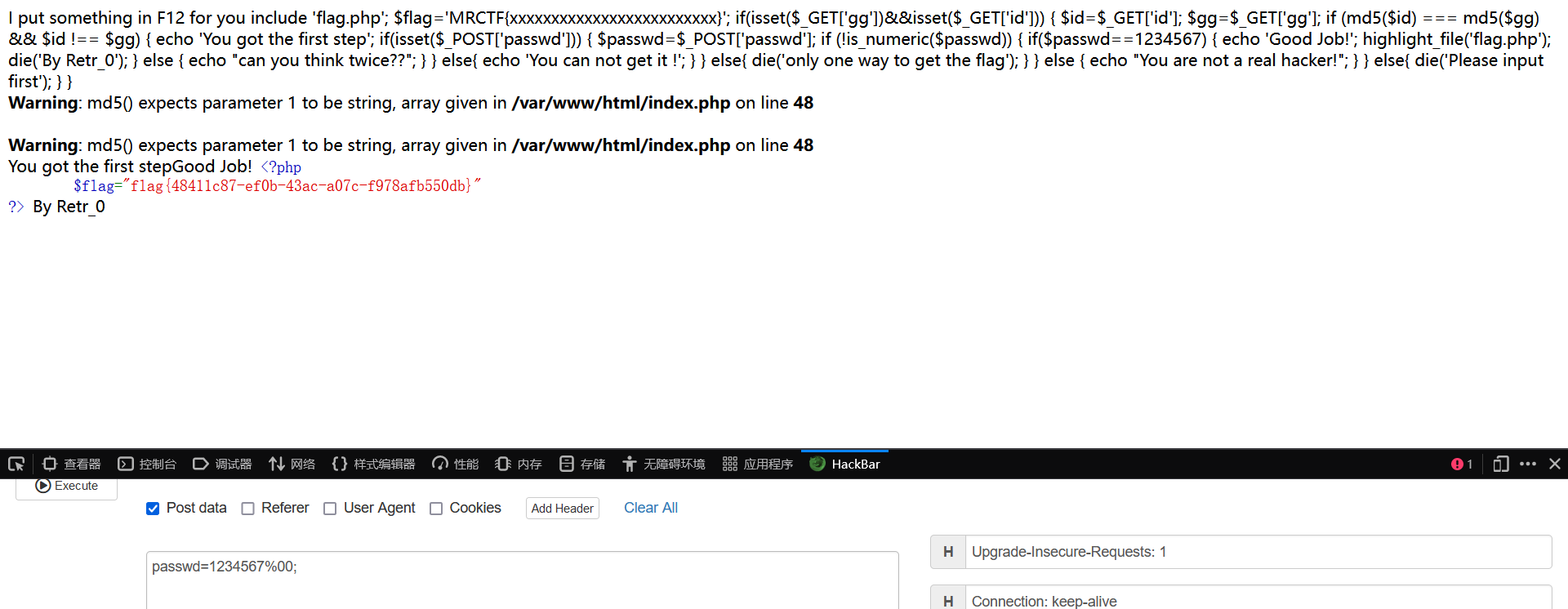1 2 3 4 5 6 7 8 9 10 11 12 13 14 15 16 17 18 19 20 21 22 23 24 25 26 27 28 29 30 31 32 33 34 35 36 37 38 39 40 41 include 'flag.php' ;$flag ='MRCTF{xxxxxxxxxxxxxxxxxxxxxxxxx}' ;if (isset ($_GET ['gg' ])&&isset ($_GET ['id' ])) { $id =$_GET ['id' ]; $gg =$_GET ['gg' ]; if (md5 ($id ) === md5 ($gg ) && $id !== $gg ) { echo 'You got the first step' ; if (isset ($_POST ['passwd' ])) { $passwd =$_POST ['passwd' ]; if (!is_numeric ($passwd )) { if ($passwd ==1234567 ) { echo 'Good Job!' ; highlight_file ('flag.php' ); die ('By Retr_0' ); } else { echo "can you think twice??" ; } } else { echo 'You can not get it !' ; } } else { die ('only one way to get the flag' ); } } else { echo "You are not a real hacker!" ; } }else { die ('Please input first' ); } } Please input first