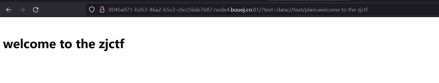 一共有三个参数,都需要通过GET方式传入 isset的作用是检测变量是否已设置并且非null file_get_contents的作用是将整个文件读入一个字符串 这里将text文件中读取字符串,还要和welcome to the zjctf相等 这里使用的是data://写入协议 payload: