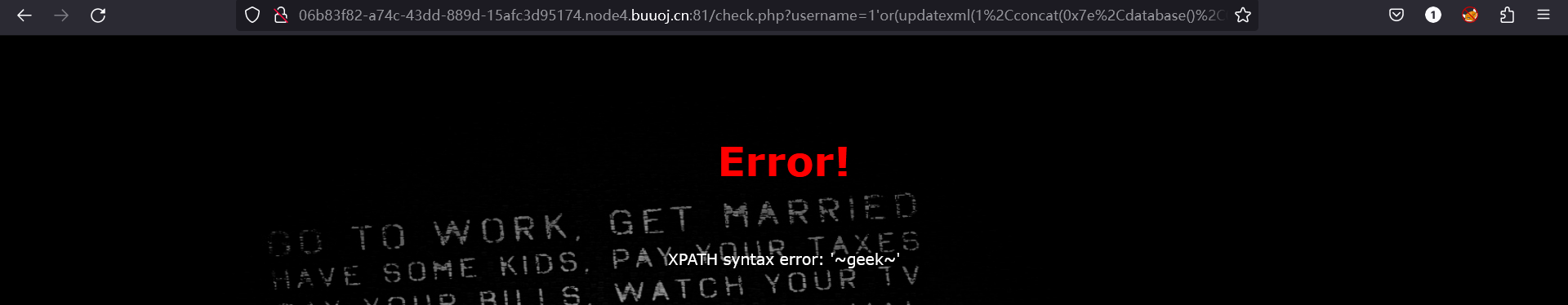 password=123 经过一系列尝试后,发现空格,=,union都被过滤了 空格被过滤我们使用()来代替空格/**/貌似也被过滤了 既然如此,尝试一下报错注入爆库 payload:username=1'or(updatexml(1,concat(0x7e,database(),0x7e),1))#&password=1
