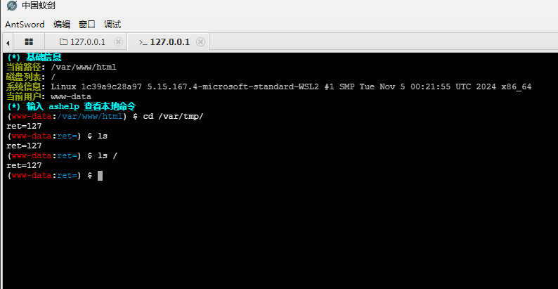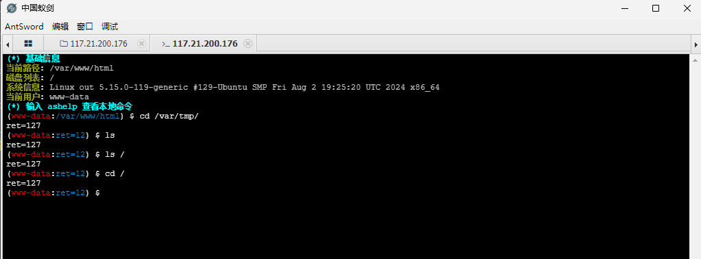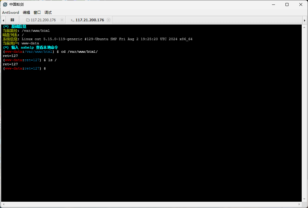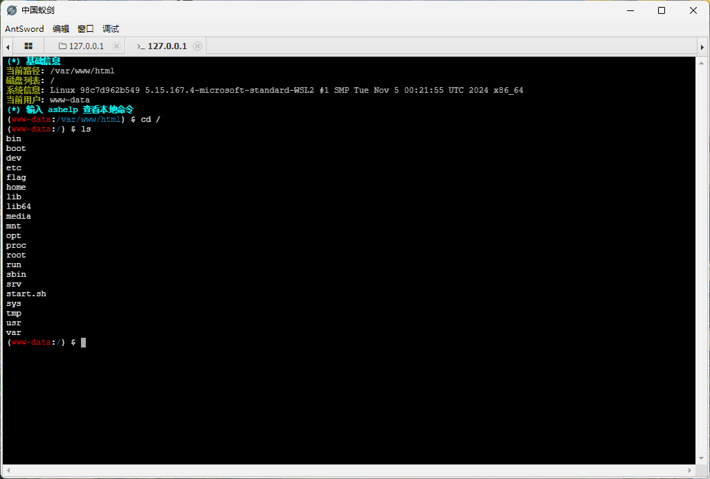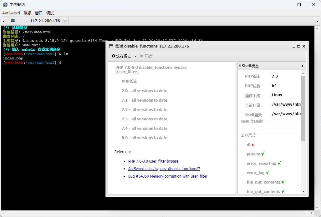 AntSword虚拟终端中已经集成了对ShellShock的利用,直接在虚拟终端执行命令即可绕过disable_functions