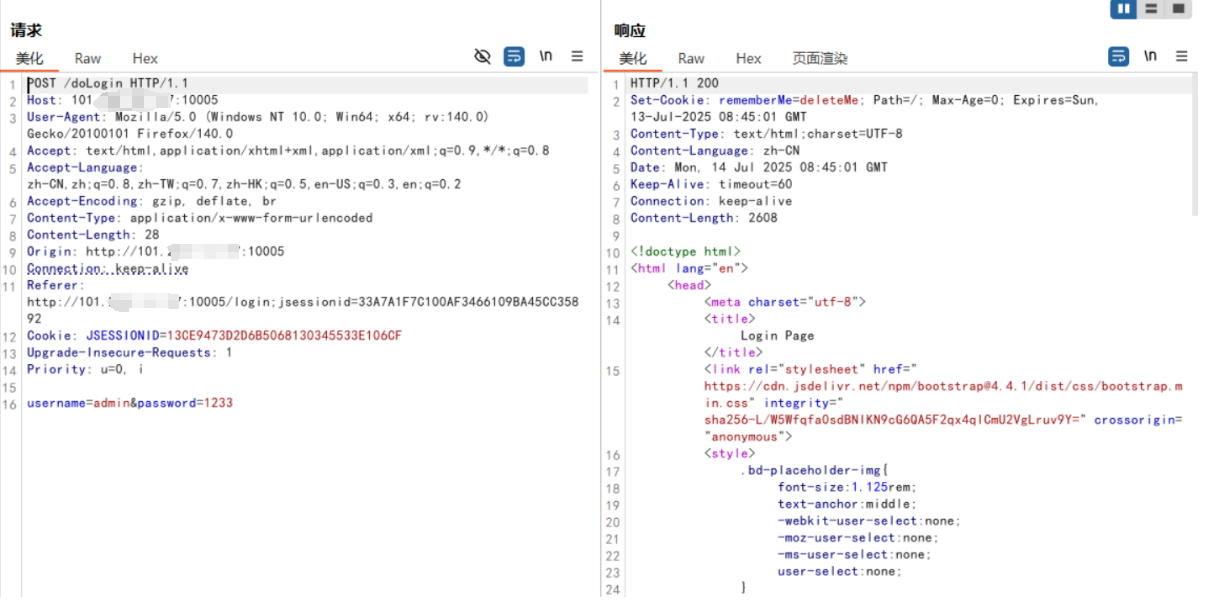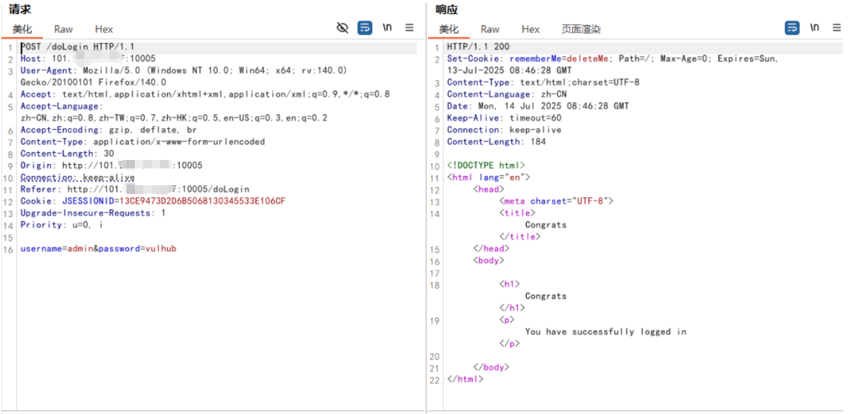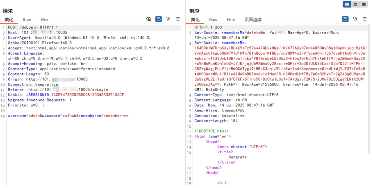 - 勾选RememberMe字段,登陆成功的话,返回包set-Cookie会有rememberMe=deleteMe字段,还会有rememberMe字段,之后的所有请求中Cookie都会有rememberMe字段